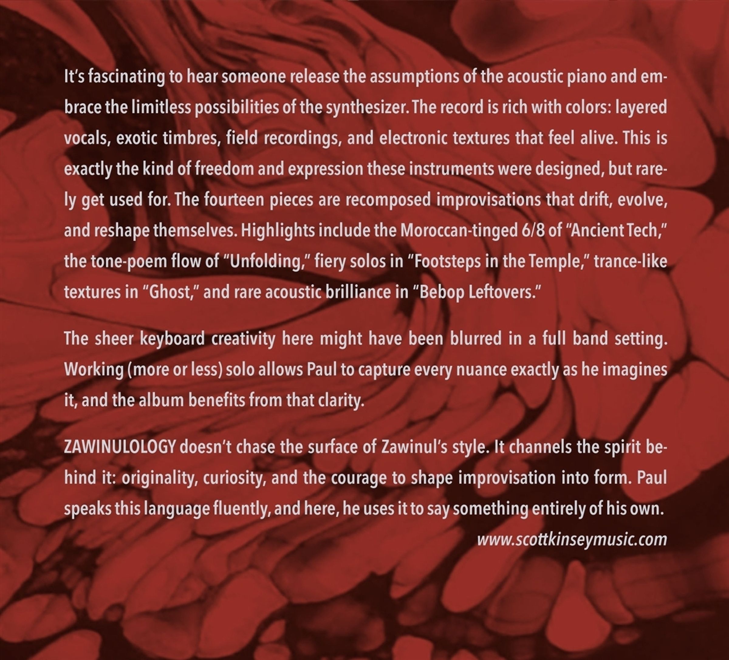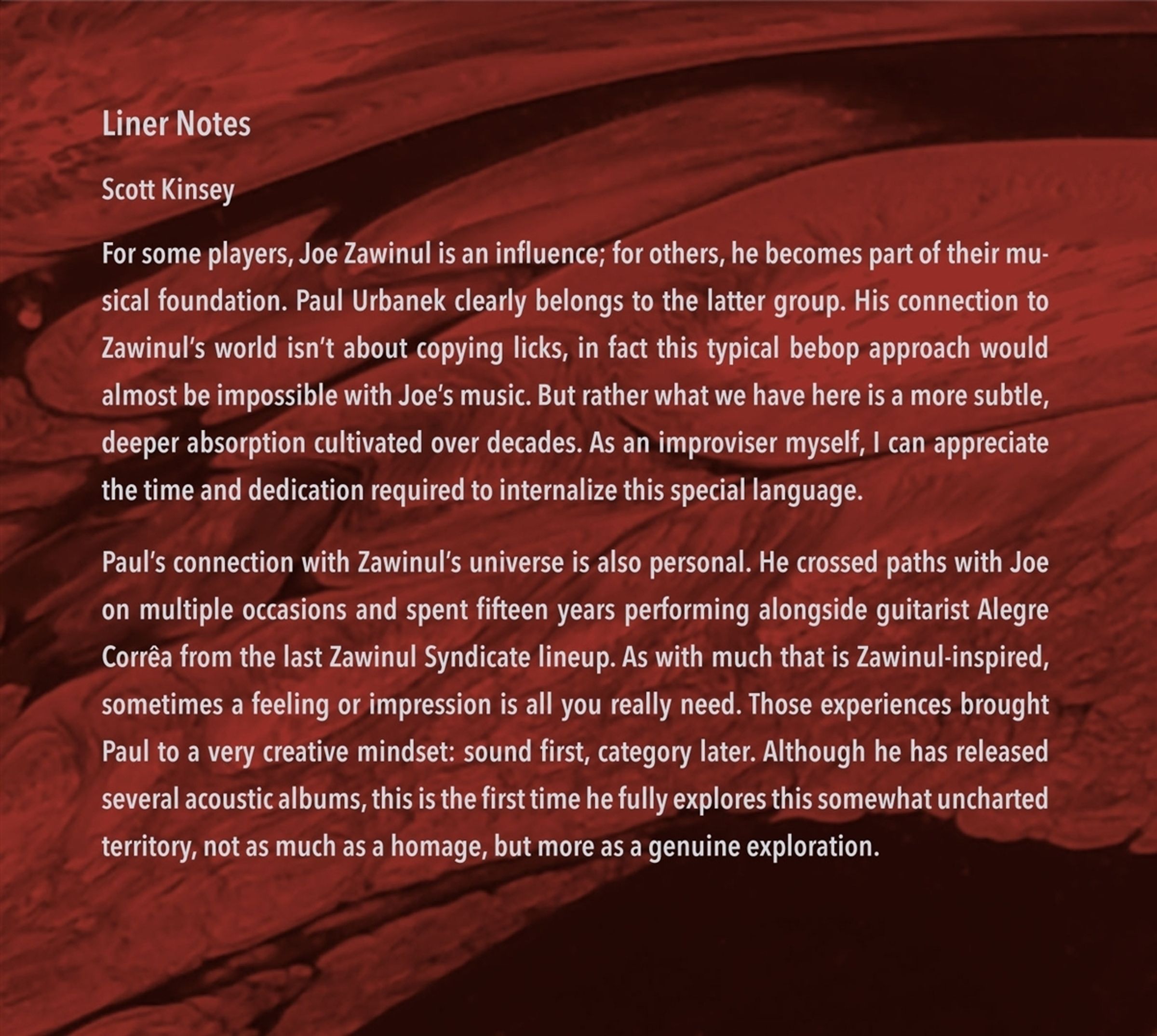 Für manche Musiker ist Joe Zawinul ein Vorbild, für andere bildet er die Grundlage ihrer Musik. Paul Urbanek gehört eindeutig zur letzteren Gruppe. Seine Verbindung zu Zawinuls Welt besteht nicht darin, Licks zu kopieren, denn dieser typische Bebop-Ansatz wäre bei Zawinuls Musik fast unmöglich. Es handelt sich vielmehr um eine subtilere, tiefere Auseinandersetzung, die über Jahrzehnte hinweg gepflegt wurde. Zawinulology kanalisiert den Geist hinter der Oberfläche: Originalität, Neugier und den