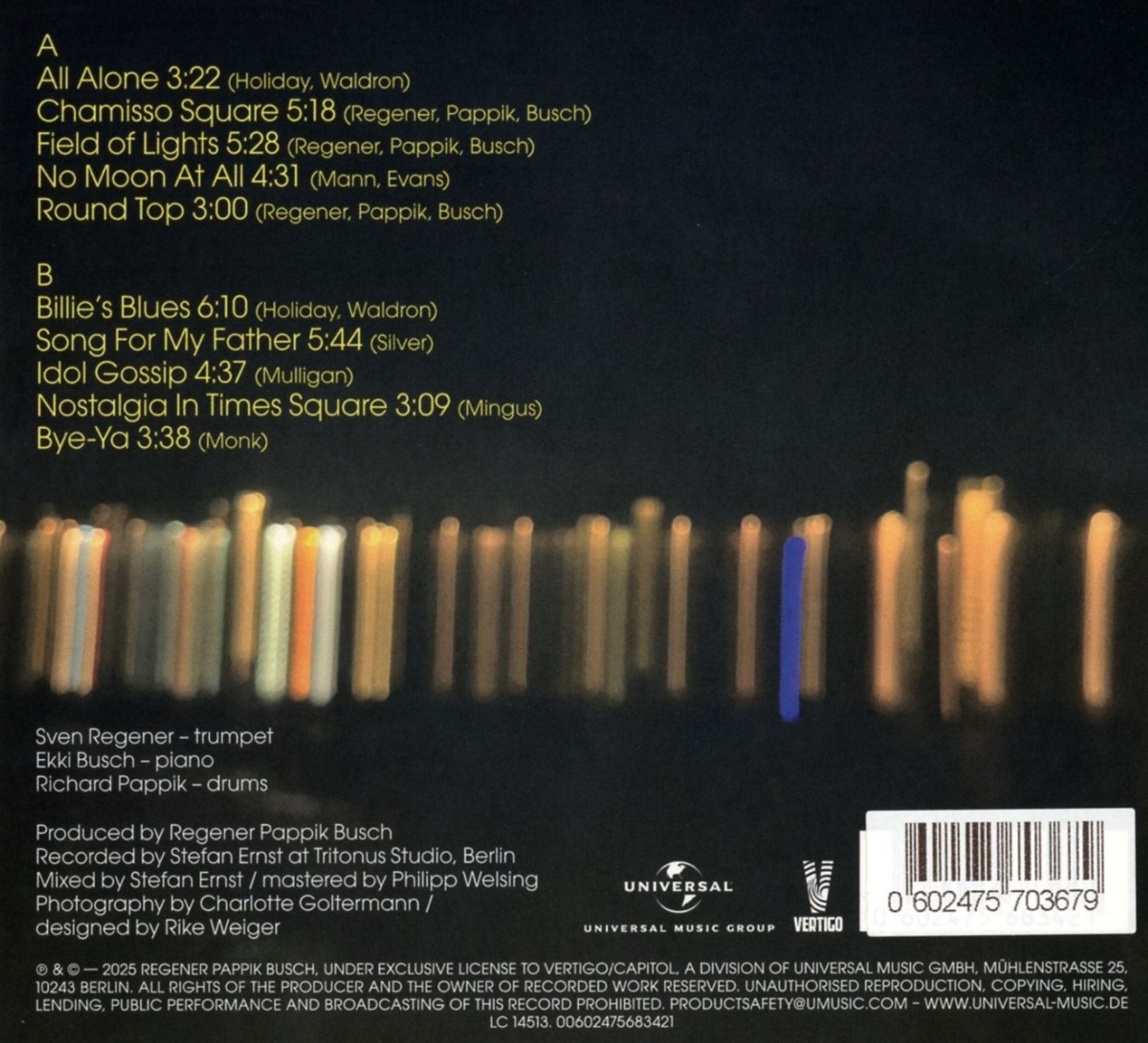 »Field of Lights«, das dritte Album von REGENER PAPPIK BUSCH, ist von maximaler Unmittelbarkeit geprägt. Durch die Triobesetzung mit Klavier, Trompete und Schlagzeug entsteht ein harter Sound, etwas Karges, Sprödes in der Musik, durch das sich Räume öffnen. Die Musik hat Platz zu Atmen.