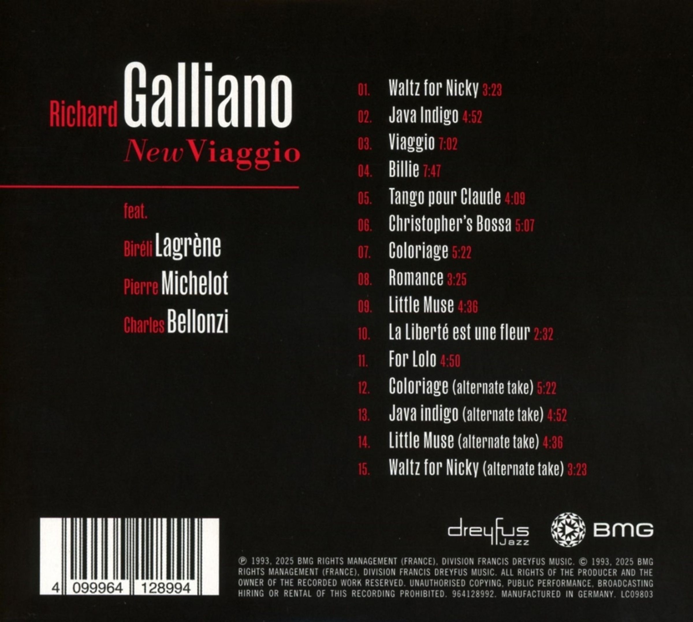 »Als ich die Aufnahmen der Studiosessions wiederentdeckte, empfand ich eine tiefe Emotion, eine Mischung aus Freude und Nostalgie. Die Präsenz von Pierre Michelot und Charles Bellonzi, diesen außergewöhnlichen Musikern, die uns verlassen haben, ist spürbar. Pierre, Miles Davis' Kontrabassist (Ascenseur pour l'échafaud), und Charles, ›Lolo‹, Nougaros Schlagzeuger (Tu verras), bildeten mit ihrer umwerfenden Sensibilität eine Rhythmusgruppe von seltener Eleganz. Und last but not least war Biréli Lagrène, virtuoser Gitarrist und langjähriger Freund, immer bei uns und verlieh dem Ensemble eine atemberaubende Magie. Ich freue mich sehr, diese neue Version von ›Viaggio‹, bereichert durch jüngste Entdeckungen, mit Ihnen teilen zu können. Ich bin begeistert, diese musikalische Reise mit neuen Begleitern fortsetzen zu können: Adrien Moignard an der Gitarre, Philippe Aerts am Kontrabass und Yoann Serra am Schlagzeug. Ihr Talent und ihre Sensibilität verleihen diesen Kompositionen eine neue Dimension. Ich bin sicher, dass Francis Dreyfus und Yves Chamberland, die verstorbenen Produzenten dieses Albums, hätten diese Initiative unterstützt. Ich hoffe, dass Sie alle die gleiche Begeisterung empfinden wie wir, wenn Sie diese Wiedergeburt der Neuen Musette hören, einer Musik, die ihre Wurzeln in der Vergangenheit hat, um in der Gegenwart besser zu gedeihen. Ich widme dieses neue Werk dem Andenken an Francis Dreyfus, Yves Chamberland, Pierre Michelot, Charles ›Lolo‹ Bellonzi und Astor Piazzolla, die mich dazu drängten, die Neue Musette für diese Aufnahme zu schaffen.« – Richard Galliano