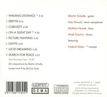 »Zu Fuß erreichbar« – ein Hinweis, der Leichtigkeit, Entspannung und geringen Aufwand vermuten lässt, um ans gewünschte Ziel zu kommen. Und eine ideale Zustandsbeschreibung für das neue Album von Martin Schulte und seinem Quartett. Mit »Walking Distance« legt der 35-jährige Jazzgitarrist aus Köln seinen dritten Longplayer als Bandleader vor. Darauf demonstriert Schulte, dass er die lebendige deutsche Jazz-Szene nicht nur als versierter, facettenreicher Gitarrist bereichert, sondern vor allem auch als Komponist und Arrangeur.