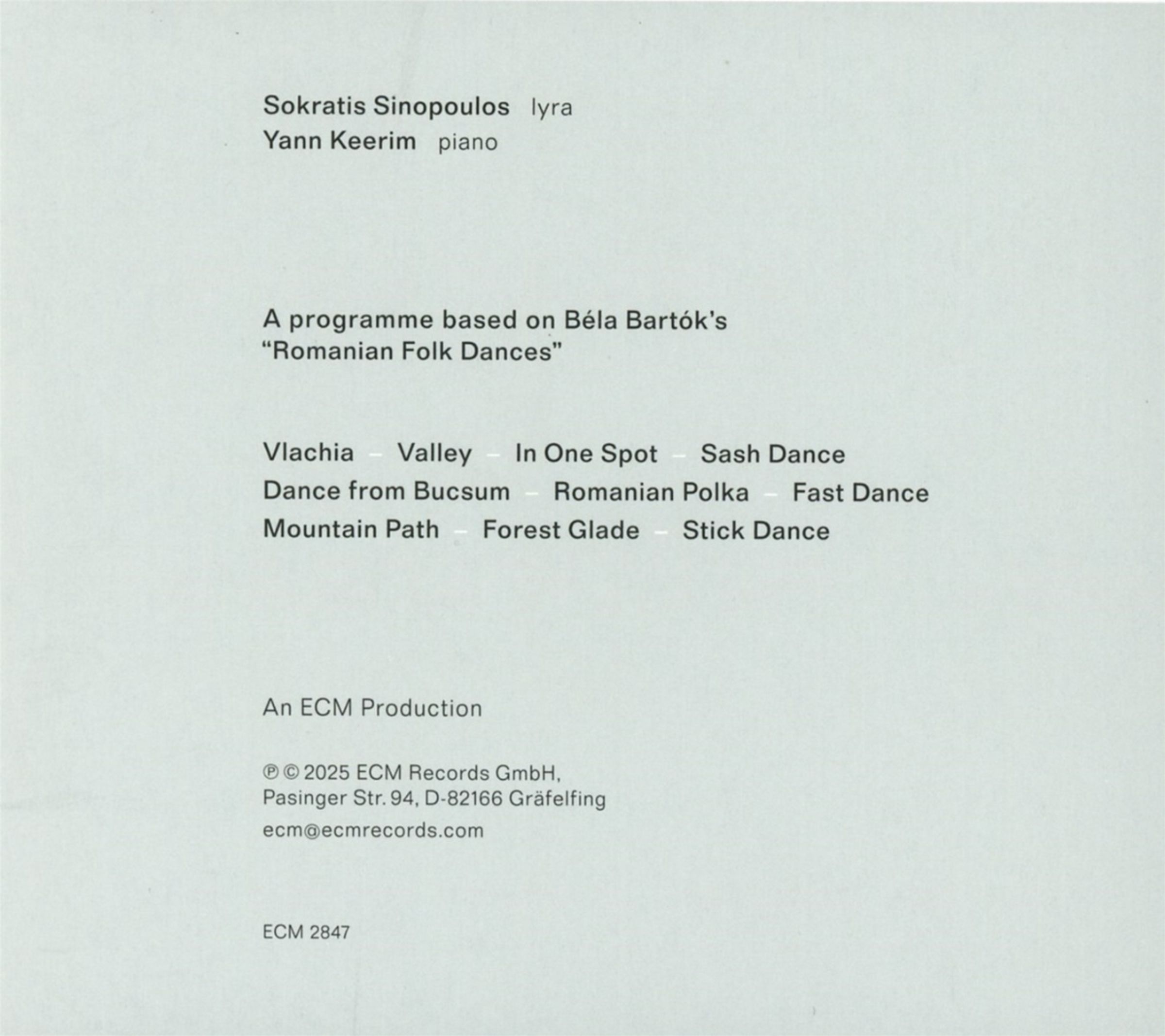 Das griechische Duo des Lyraspielers Sokratis Sinopoulos und Pianist Yannis Kirimkiridis präsentiert mit seinem ersten Studioalbum einen Fundus an inspirierten musikalischen Dialogen, die nahtlos den idiomatischen Raum zwischen europäischer Volkstradition und Kammerjazz überbrücken. Bartóks sechs „Rumänische Volkstänze“ erscheinen auf dem Album in neuem Gewand, wobei Sokratis' Lyraspiel einen gesanglichen Kontrapunkt zu Yannis' mal rhythmisch treibender, mal nachdenklich pulsierender Begleitung setzt. Es ist das erste Mal, dass das Duo aus Sokratis' gefeiertem Quartett (mit den Alben Eight Winds und Metamodal) abgekapselt zu hören ist und ihre Interaktion greift in dieser intimen Formation elegant ineinander, mit einem ausgeprägten Gespür für Raum und Atmosphäre. Die eigenen Stücke fügen sich mühelos in die Bartók-Studien ein, da alles durch den fließenden Ausdruck des Duos miteinander verbunden wird. Das Album wurde im Februar 2024 in Athen aufgenommen.