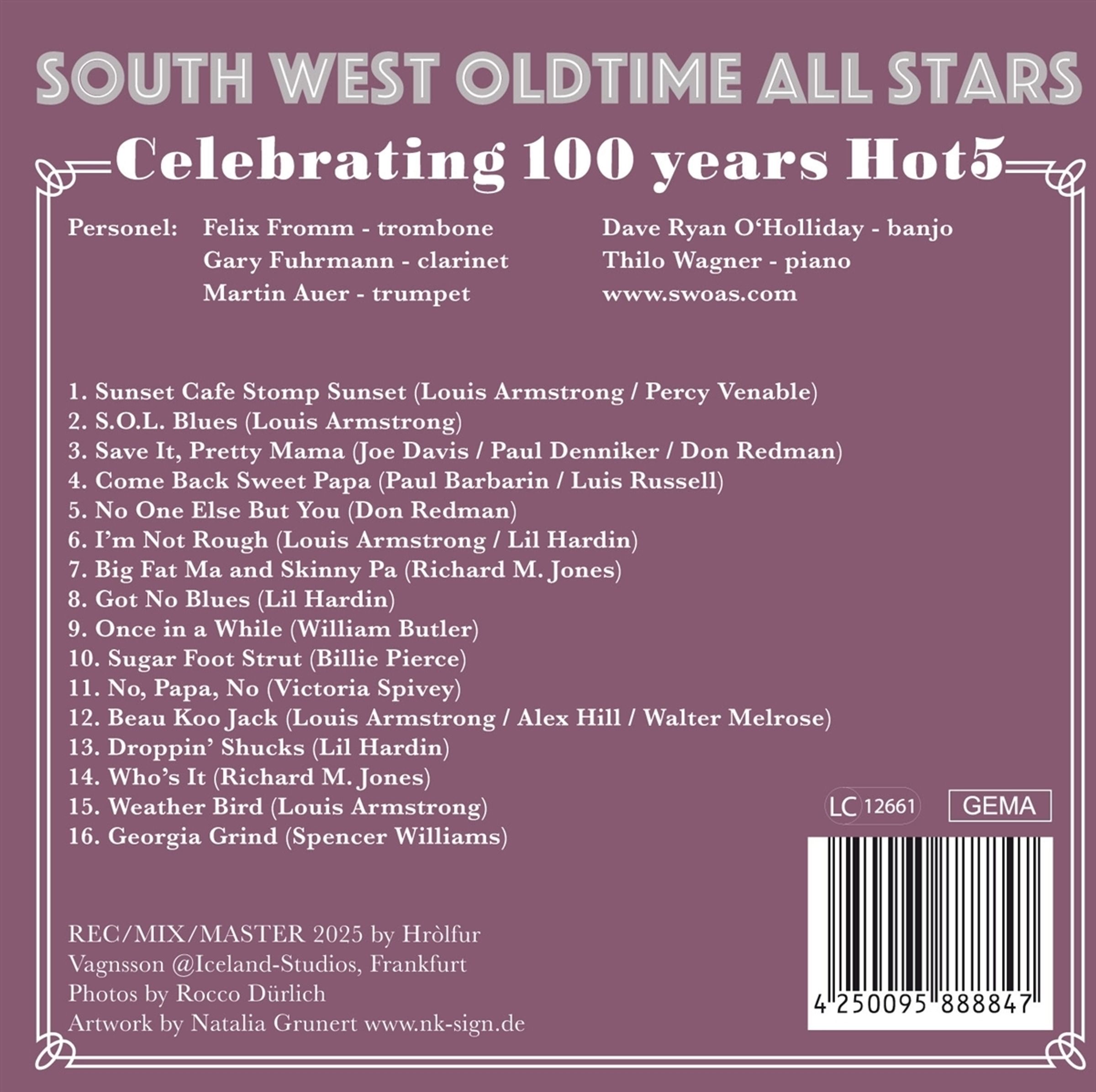 Die South West Oldtime All Stars (SWOAS) haben sich seit ihrer Gründung 2018 mit weit über 200 Konzerten zu einer festen Größe in der europäischen Traditional-Jazz-Szene etabliert. Ursprünglich kommen die Musiker aus dem Südwesten (South West) der Republik (The Land"), sind allesamt studierte Jazzmusiker und lieben alle Variationen des Classic Jazz". In ihren ersten drei CD-Einspielungen befasst sich die Band ausschließlich mit dem Repertoire von Louis Armstrongs musikalisch wichtigsten Projekten, den Hot5" und Hot7" aus der Zeit von 1925 bis 1928 - reine Studioproduktionen, mit denen Satchmo nie auf Tour ging. Mit ihrem neuen Album feiern die SWOAS 100 Jahre Louis Armstrongs Hot5" und spielen zahlreiche Konzerte in der Original Hot5-Besetzung!