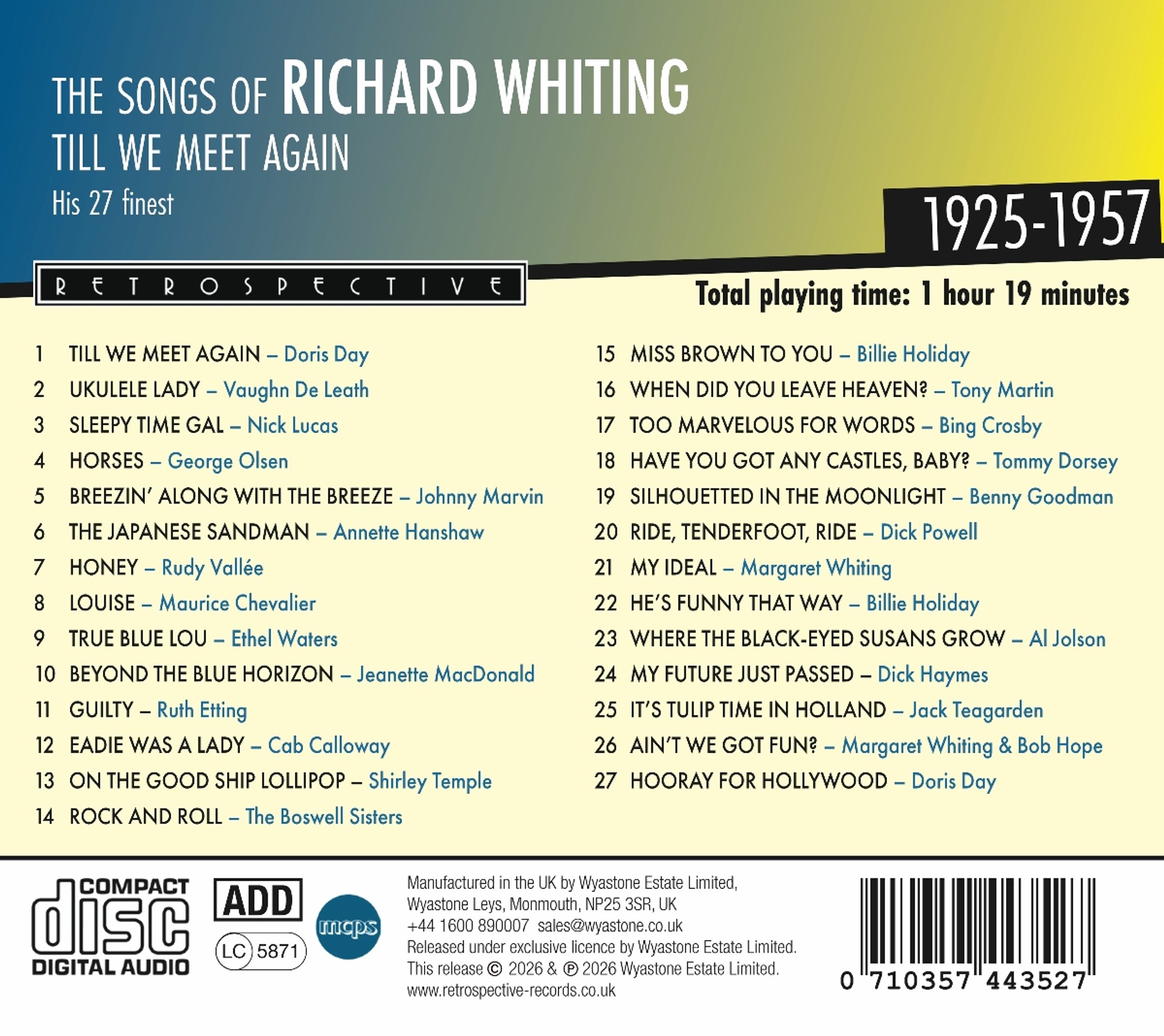 Die neueste Veroffentlichung in der Reihe "The Songs Of..." von Retrospective, die den grossten Songwritern aller Zeiten gewidmet ist, ist eine Hommage an einen der bedeutendsten popularen Songwriter des 20. Jahrhunderts, Richard Whiting (1891-1938). Seine Songs gehorten zu den ikonischen Klangen ihrer Zeit, darunter zeitlose Evergreens wie "Till We Meet Again", "Sleepy Time Gal", "She's Funny That Way" und "Guilty". Seit den Anfangen des Tonfilms