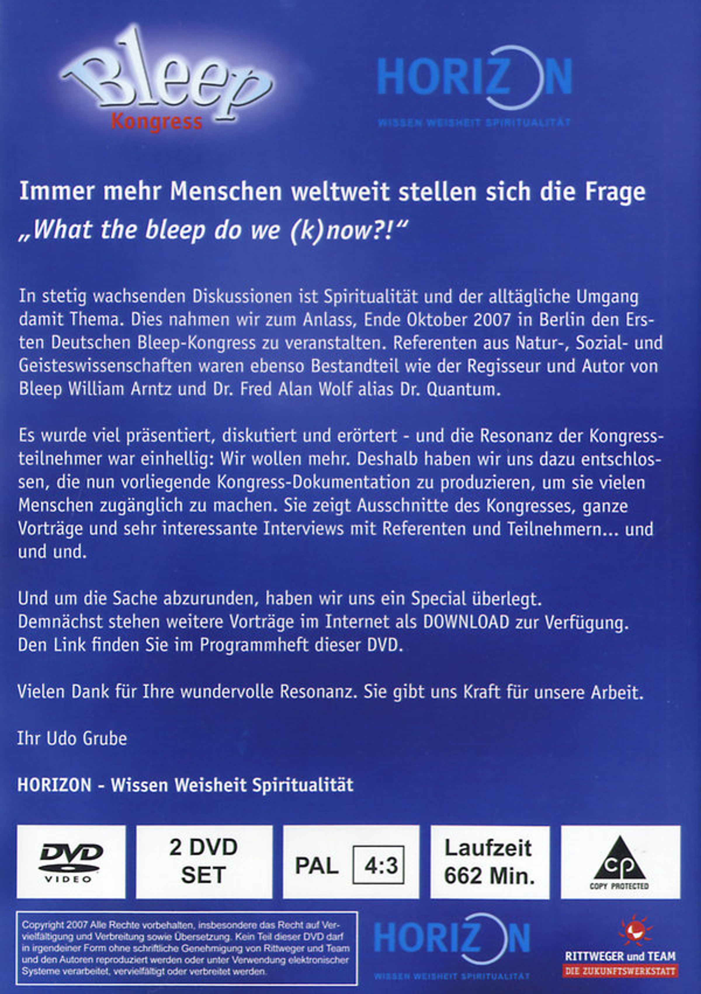 In stetig wachsenden Diskussionen ist Spiritualität und der alltägliche Umgang damit Thema. Dies nahmen wir zum Anlass, Ende Oktober 2007 in Berlin den Ersten Deutschen Bleep-Kongress zu veranstalten. Referenten aus Natur-, Sozial- und Geisteswissenschaften waren ebenso Bestandteil wie der Regisseur und Autor von Bleep William Arntz und Dr. Fred Alan Wolf alias Dr. Quantum. Es wurde viel präsentiert, diskutiert und erörtert - und die Resonanz der Kongressteilnehmer war einhellig: Wir wollen mehr. Deshalb haben wir uns dazu entschlossen, die nun vorliegende Kongress-Dokumentation zu produzieren, um sie vielen Menschen zugänglich zu machen. Sie zeigt Ausschnitte des Kongresses, ganze Vorträge und sehr interessante Interviews mit Referenten und Teilnehmern... und und und. Und um die Sache abzurunden, haben wir uns ein Special überlegt. Demnächst stehen weitere Vorträge im Internet als DOWNLOAD zur Verfügung. Den Link fi nden Sie im Programmheft dieser DVD.