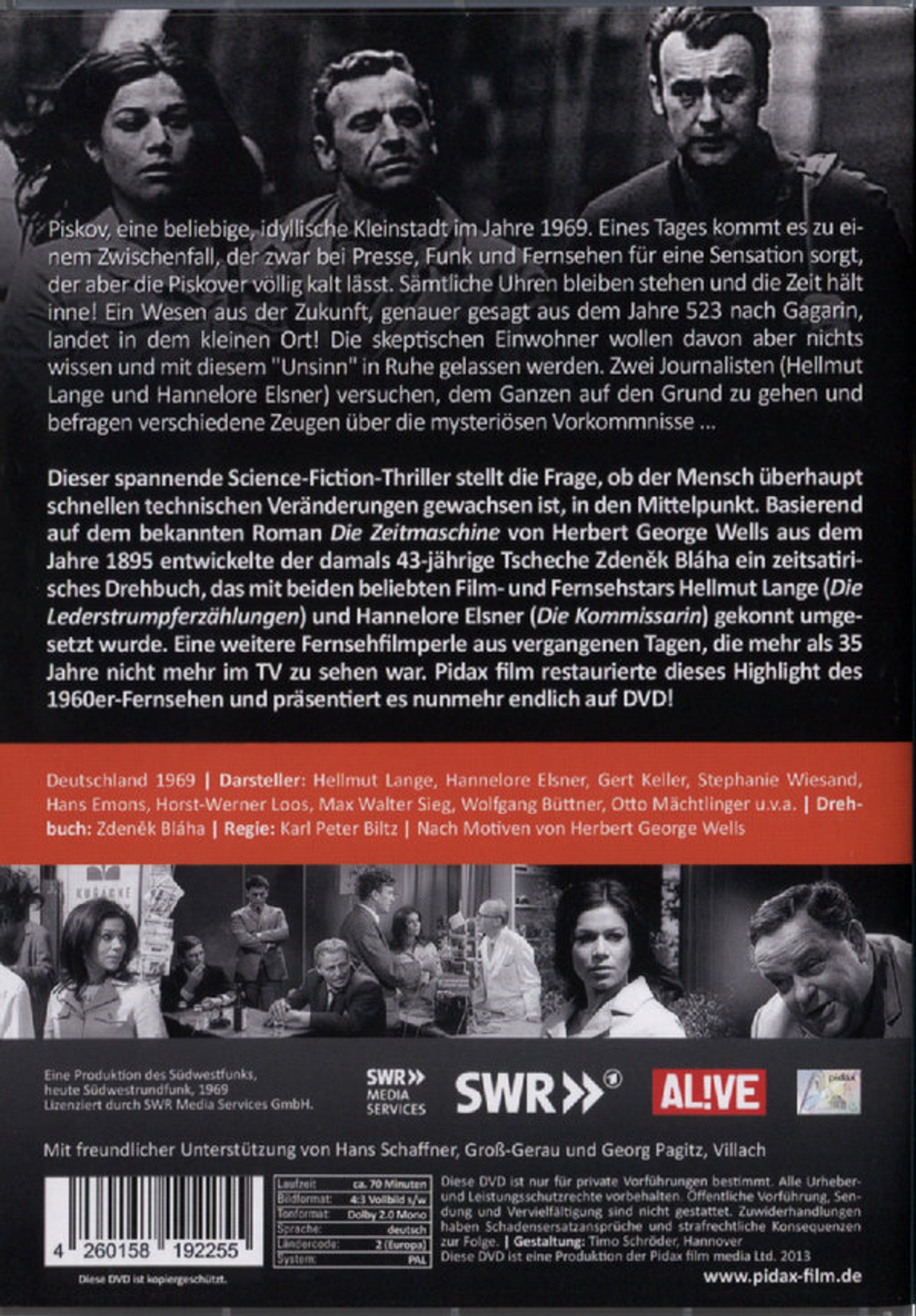Dieser spannende Science-Fiction-Thriller stellt die Frage, ob der Mensch überhaupt schnellen technischen Veränderungen gewachsen ist, in den Mittelpunkt. Basierend auf dem bekannten Roman „Die Zeitmaschine“ von Herbert George Wells aus dem Jahre 1895 entwickelte der damals 43-jährige Tscheche Zden?k Bláha ein zeitsatirisches Drehbuch, das mit beiden beliebten Film- und Fernsehstars Hellmut Lange („Die Lederstrumpferzählungen“) und Hannelore Elsner („Die Kommissarin“) gekonnt umgesetzt wurde. Eine weitere Fernsehfilmperle aus vergangenen Tagen, die mehr als 35 Jahre nicht mehr im TV zu sehen war. Pidax film restaurierte dieses Highlight des 1960er-Fernsehen und präsentiert es nunmehr endlich auf DVD!