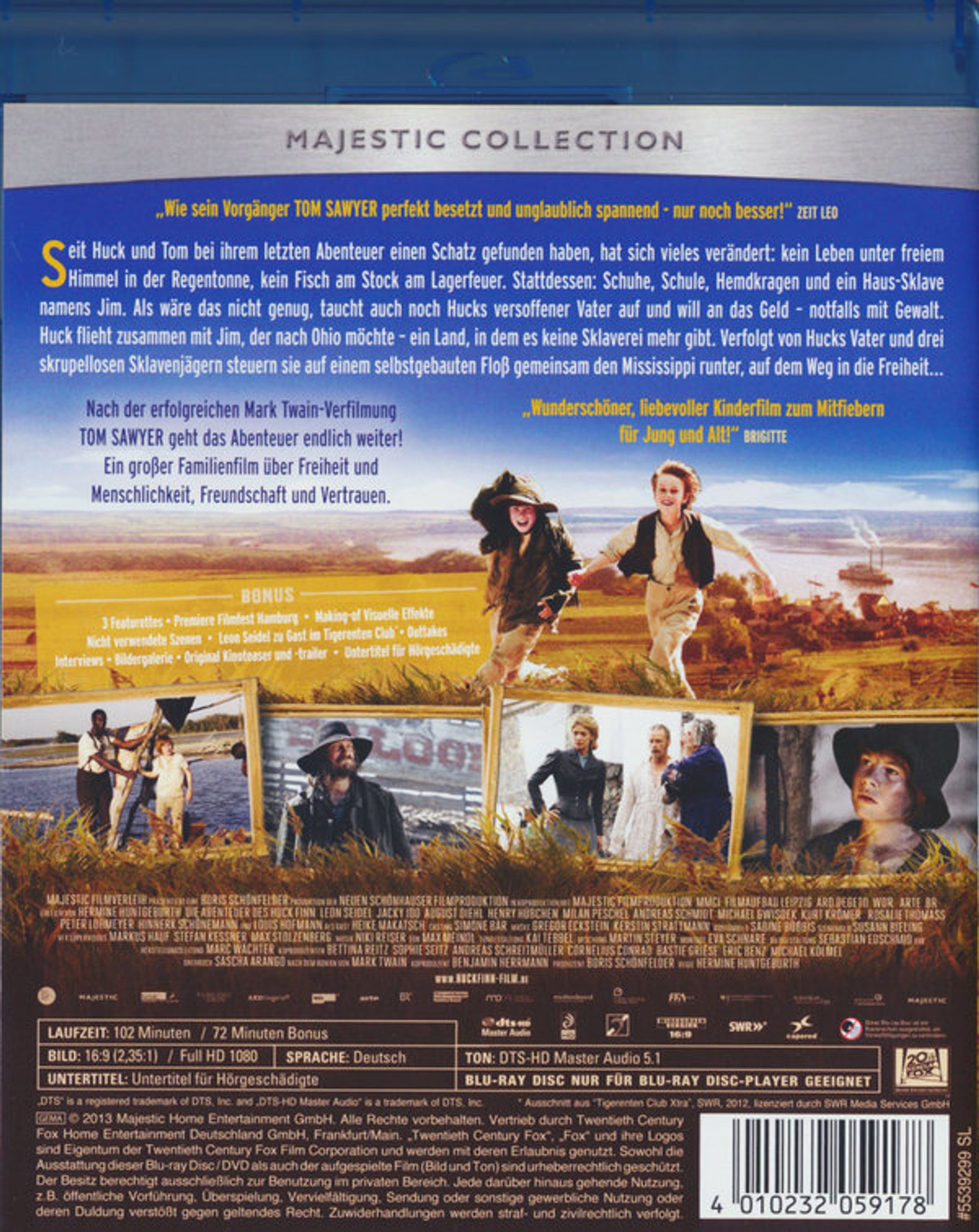 "Die Abenteuer des Huck Finn" steht in großer gelber Schrift. Darunter Huck und Jim freudig in einer ländlichen Szene., Blu-ray Disc
