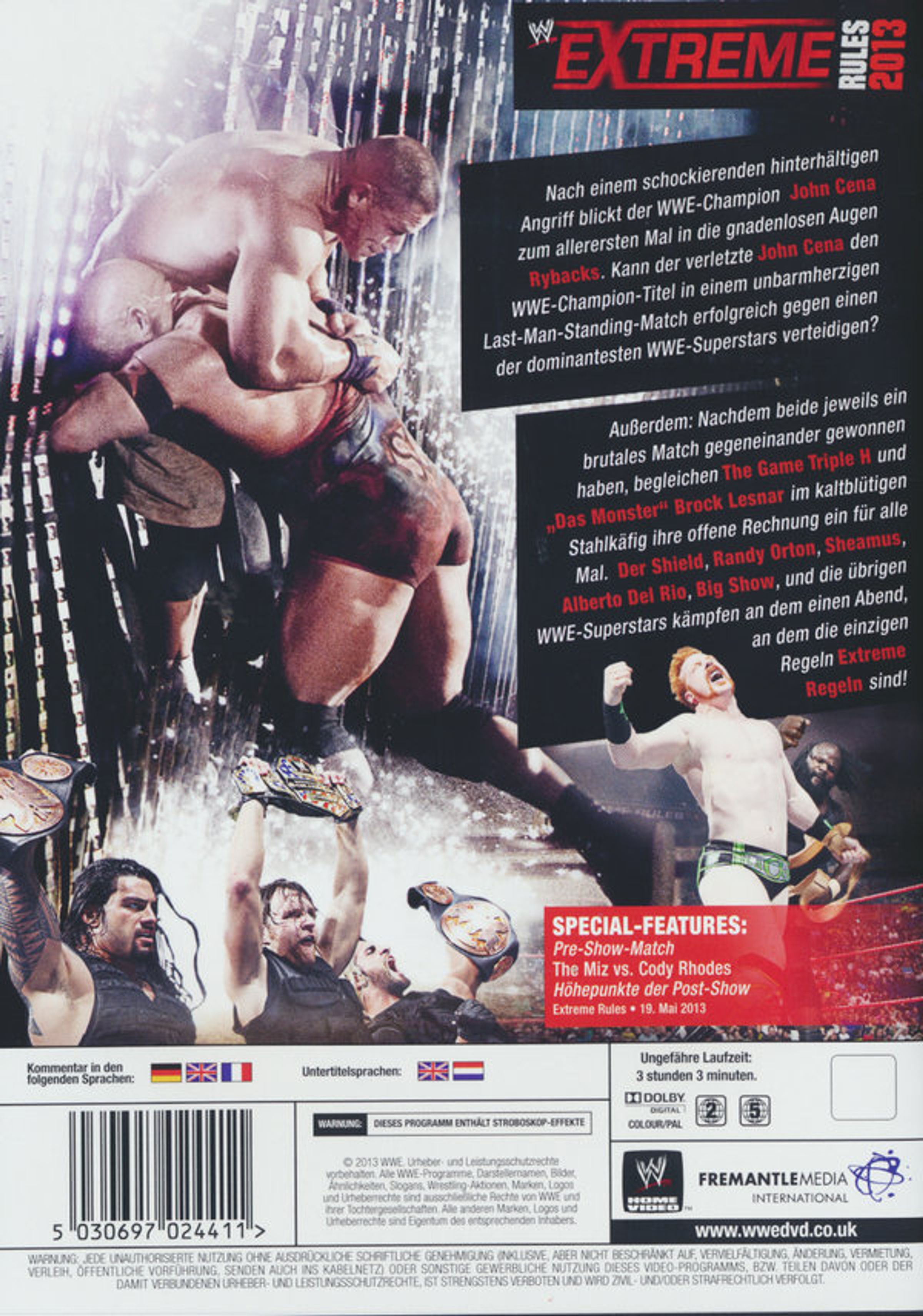 Nach einem schockierenden hinterhältigen Angriff blickt der WWE-Champion John Cena zum allerersten Mal in die gnadenlosen Augen Rybacks. Kann der verletzte John Cena den WWE-Champion-Titel in einem unbarmherzigen Last-Man-Standing-Match erfolgreich gegen einen der dominantesten WWE-Superstars verteidigen? Außerdem: Nachdem beide jeweils ein brutales Match gegeneinander gewonnen haben, begleichen The Game Triple H und „Das Monster“ Brock Lesnar im kaltblütigen Stahlkäfig ihre offene Rechnung ein für alle Mal. Der Shield, Randy Orton, Sheamus, Alberto Del Rio, Big Show und die übrigen WWE-Superstars kämpfen an dem einen Abend, an dem die einzigen Regeln extreme Regeln sind!