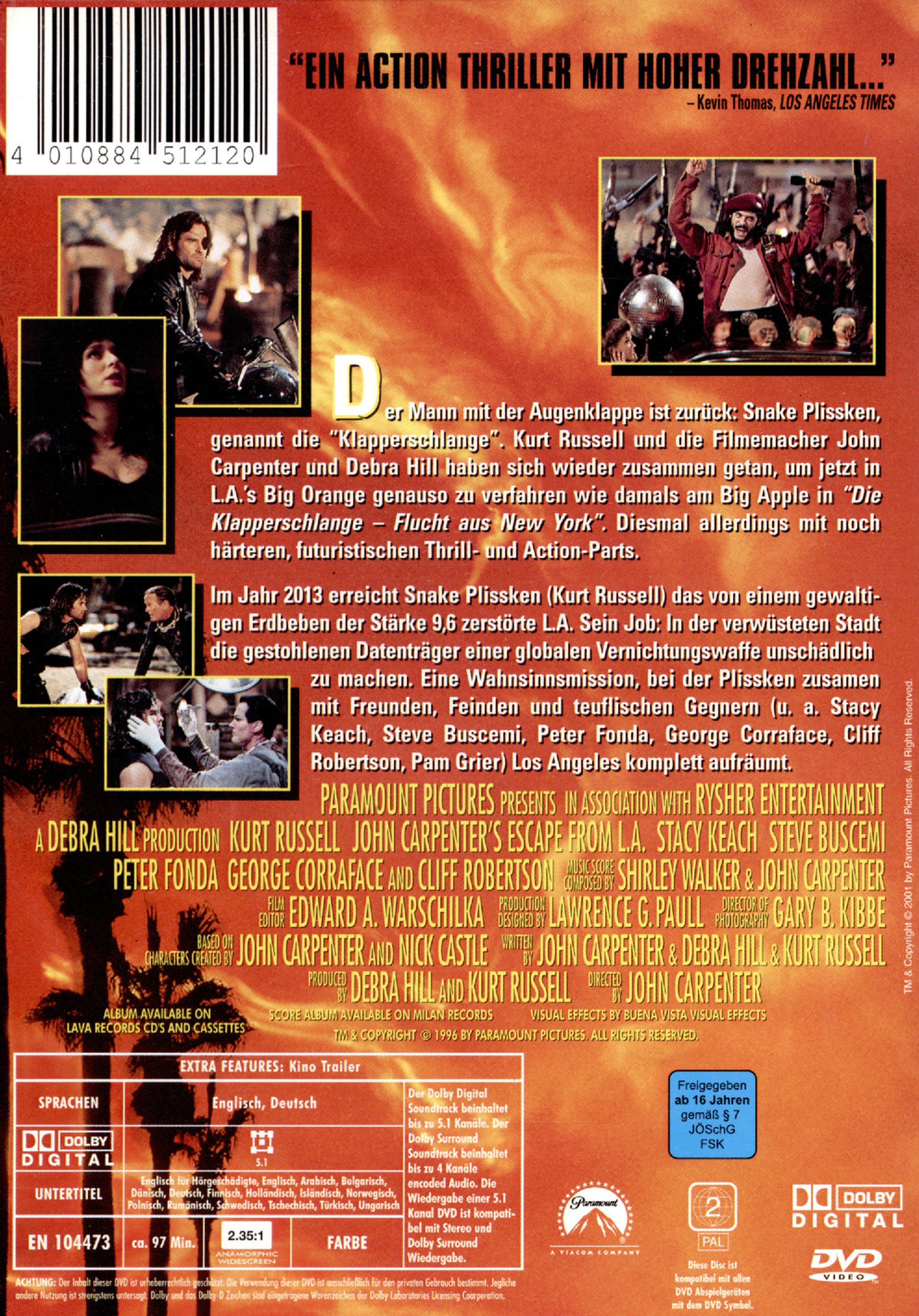 Der Mann mit der Augenklappe ist zurück: Snake Plissken, genannt die »Klapperschlange«. Kurt Russell und die Filmemacher John Carpenter und Debra Hill haben sich wieder zusammengetan, um jetzt in L.A.’s Big Orange genauso zu verfahren, wie damals am Big Apple in »Die Klapperschlange - Flucht aus New York«. Diesmal allerdings mit noch härteren, futuristischen Thrill- und Action-Parts. Im Jahr 2013 erreicht Snake Plissken das von einem gewaltigen Erdbeben der Stärke 9,6 zerstörte L.A. Sein Job: In der verwüsteten Stadt die gestohlenen Datenträger einer globalen Vernichtungsmaschine aufzutreiben und unschädlich zu machen. Eine Wahnsinnsmission, bei der Plissken mit Freunden, Feinden und seinen teuflischen Gegnern Los Angeles komplett aufräumt.