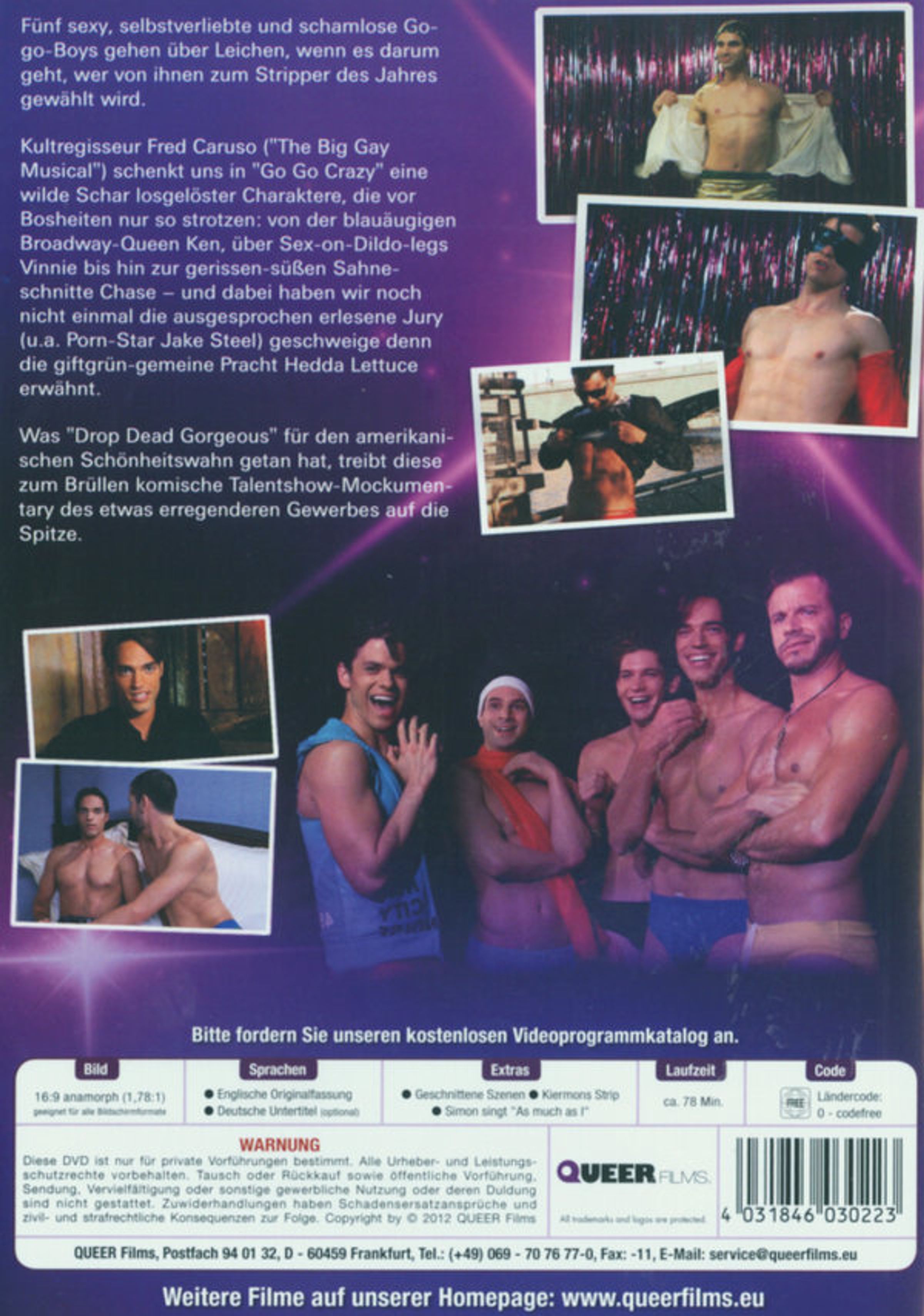 Fünf sexy, selbstverliebte und schamlose Go-go-Boys gehen über Leichen, wenn es darum geht, wer von ihnen zum Stripper des Jahres gewählt wird. Kultregisseur Fred Caruso (‘The Big Gay Musical‘) schenkt uns in ‘Go Go Crazy‘ eine wilde Schar losgelöster Charaktere, die vor Bosheiten nur so strotzen: von der blauäugigen Broadway-Queen Ken, über Sex-on-Dildo-legs Vinnie bis hin zur gerissen-süßen Sahneschnitte Chase – und dabei haben wir noch nicht einmal die ausgesprochen erlesene Jury (u. a. Porno-Star Jake Steel) geschweige denn die giftgrüngemeine Pracht Hedda Lettuce erwähnt. Was ‘Drop Dead Gorgeous‘ für den amerikanischen Schönheitswahn getan hat, treibt diese zum Brüllen komische Talentshow-Mockumentary des etwas erregenderen Gewerbes auf die Spitze.