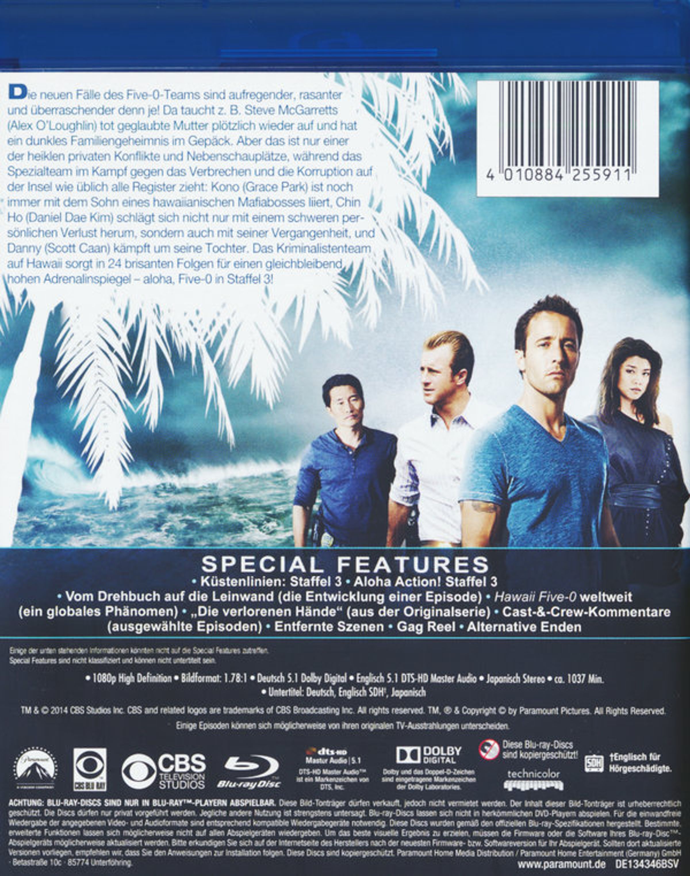 - Küstenlinien: Staffel 3; Aloha Action! Staffel 3; Vom Drehbuch auf die Leinwand (die Entwicklung einer Episode); Hawaii Five-0 weltweit (ein globales Phänomen); Die verlorenen Hände (aus der Original-Serie); Cast-&-Crew-Kommentare (ausgewählte Episoden) Entfernte Szenen; Gag Reel; Alternative Enden