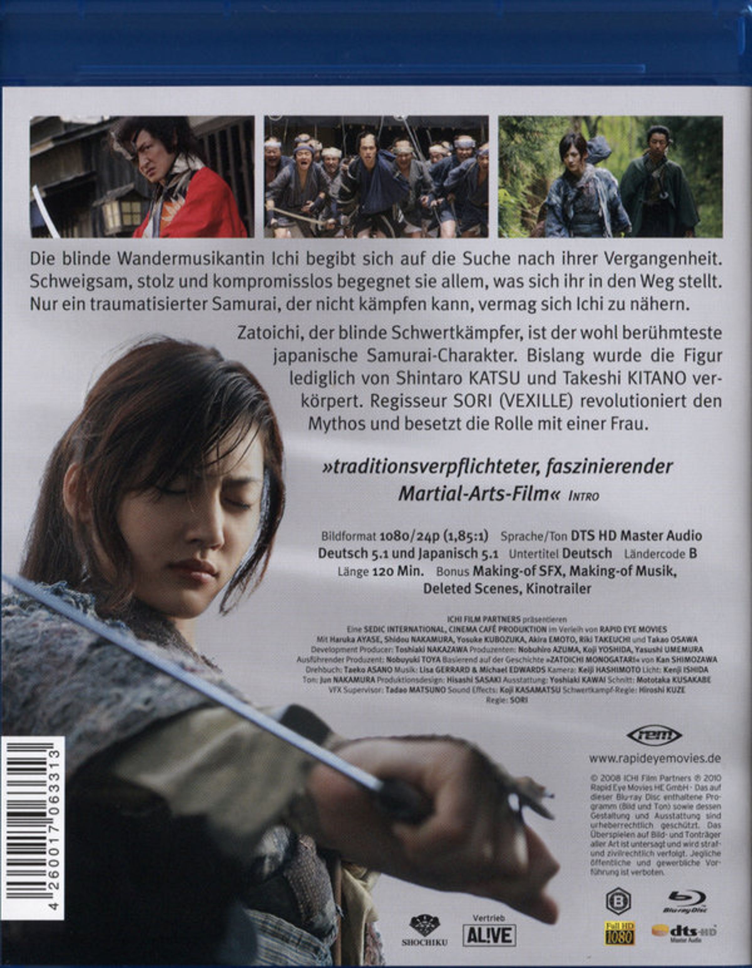 Zatoichi, der blinde Schwertkämpfer auf Suche nach Gerechtigkeit, ist der wohl berühmteste Samurai-Charakter der japanischen Film- und TV-Geschichte. Bislang wurde die Figur lediglich von zwei Schauspielern verkörpert: Shintaro Katsu und Takeshi Kitano. Regisseur Sori (Vexille) revolutioniert den Mythos und besetzt in seinem humorvollen und romantischen Schwertkampf-Drama die Rolle mit einer Frau, dem japanischen Jungstar Haruka Ayase (Cyborg She). Die eleganten und starken Bilder werden untermalt von dem eindringlichen Soundtrack der australischen Musikerin Lisa Gerrard (Dead Can Dance).