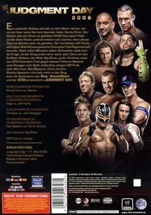 Judgment Day 2009 konnte mit einigen aufregenden Begegnungen aufwarten. Unter anderem sinnt Batista auf Rache, nachdem ihm Randy Orton fast die Karriere gekostet hat. Es ging um den WWE-Titel. Aber es gab auch noch weitere Titelkämpfe. Zum Beispiel jeff hardy gegen Edge! Oder Christian gegen Jack Swagger. Zudem am Start: Rey Mysterio, Shelton Benjamin, John Morrison, John Cena, Big Show,... Ein absolutes Staraufgebot aus Smackdown, RAW und ECW!