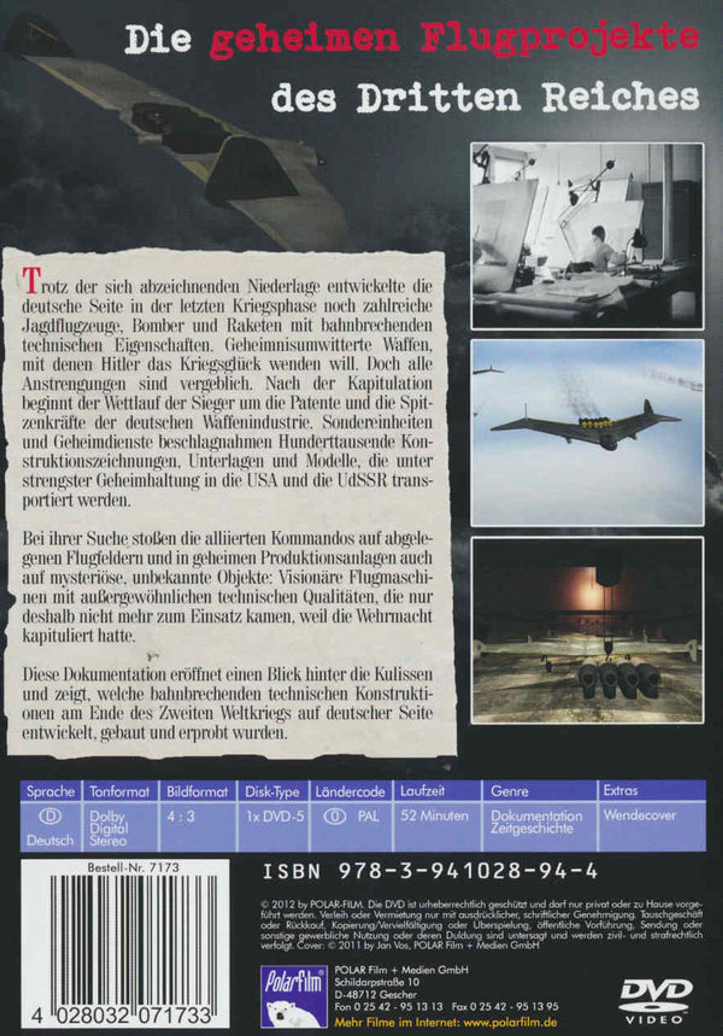Trotz der sich abzeichnenden Niederlage entwickelte die deutsche Seite in der letzten Kriegsphase noch zahlreiche Jagdflugzeuge, Bomber und Raketen mit bahnbrechenden technischen Eigenschaften. Geheimnisumwitterte Waffen, mit denen Hitler das Kriegsglück wenden will. Doch alle Anstrengungen sind vergeblich. Nach der Kapitulation beginnt der Wettlauf der Sieger um die Patente und die Spitzenkräfte der deutschen Waffenindustrie. Militärische Sondereinheiten und Geheimdienste beschlagnahmen Hunderttausende Konstruktionszeichnungen, Unterlagen und Modelle, die unter strengster Geheimhaltung in die USA und die UdSSR transportiert werden. Diese Dokumentation eröffnet einen Blick hinter die Kulissen und zeigt, welche bahnbrechenden technischen Konstruktionen am Ende des Zweiten Weltkriegs auf deutscher Seite entwickelt, gebaut und erprobt wurden. Aufbauend auf Unterlagen, die bislang nicht zugänglich waren, erwecken aufwendige Animationen die „Geheimen Flugprojekte des Dritten Reiches“ zum ersten Mal zum Leben.
