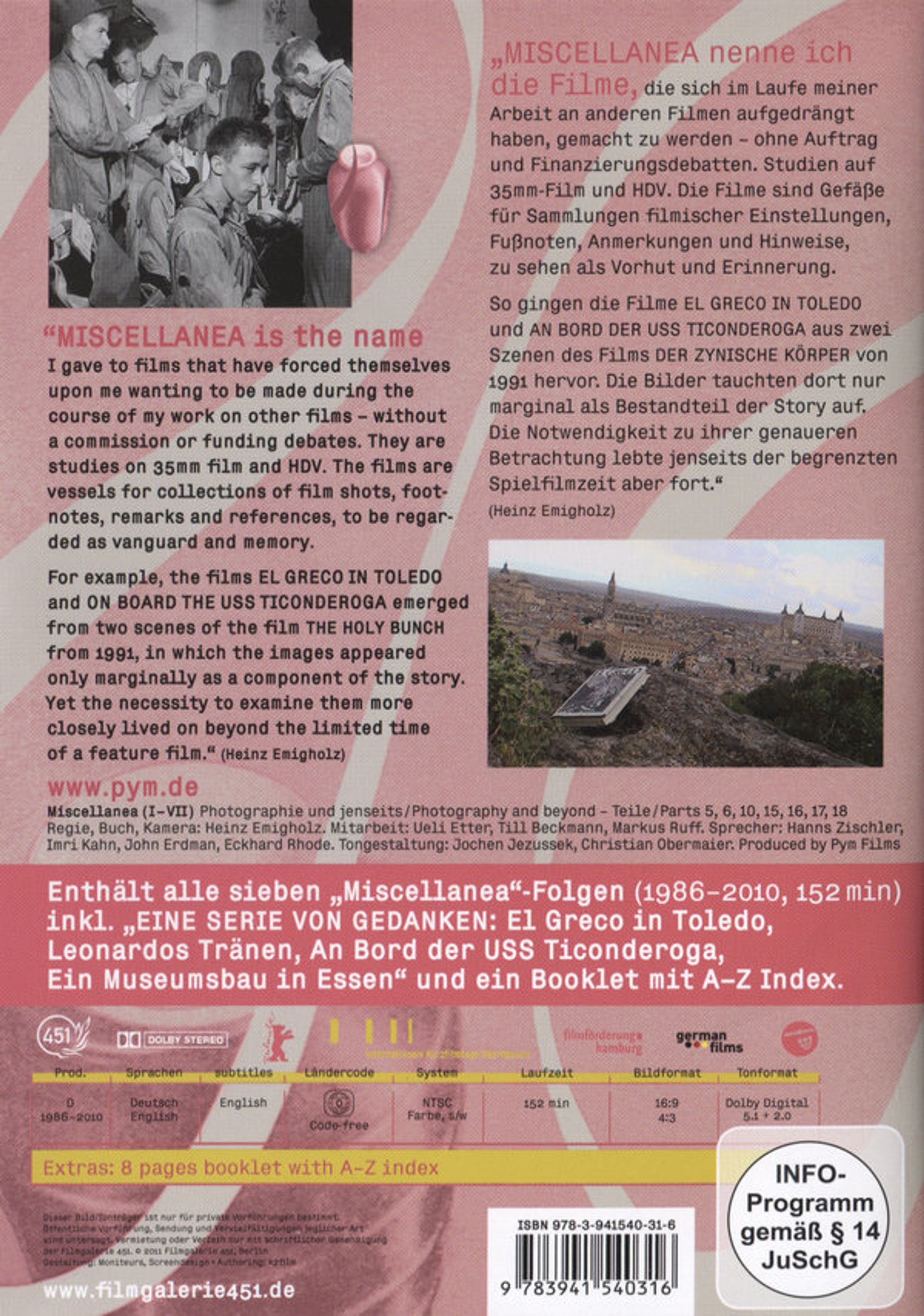 „Miscelanea nenne ich die Filme, die sich im Laufe meiner Arbeit an anderen Filmen aufgedrängt haben, gemacht zu werden – ohne Auftrag und Finanzierungsdebatten. Studien auf 35mm-Film und HDV. Die Filme sind Gefäße für Sammlungen filmischer Einstellungen, Fußnoten, Anmerkungen und Hinweise, zu sehen als Vorhut und Erinnerung. So gingen die Filme El Greco in Toledo und An Bord der USS Ticonderoga aus zwei Szenen des Films Der Zynische Körper von 1991 hervor. Die Bilder tauchten dort nur marginal als Bestandteil der Story auf. Die Notwendigkeit zu ihrer genaueren Betrachtung lebte jenseits der begrenzten Spielfilmzeit aber fort.“ (Heinz Emigholz). Die DVD enthält alle sieben „Miscellanea“-Folgen (1986–2010, 152min) inkl. EINE SERIE VON GEDANKEN: EL Greco in Toledo, Leonardos Tränen, An Bord der USS Ticonderoga, ein Museumsbau in Essen sowie ein Booklet mit A–Z Index.
