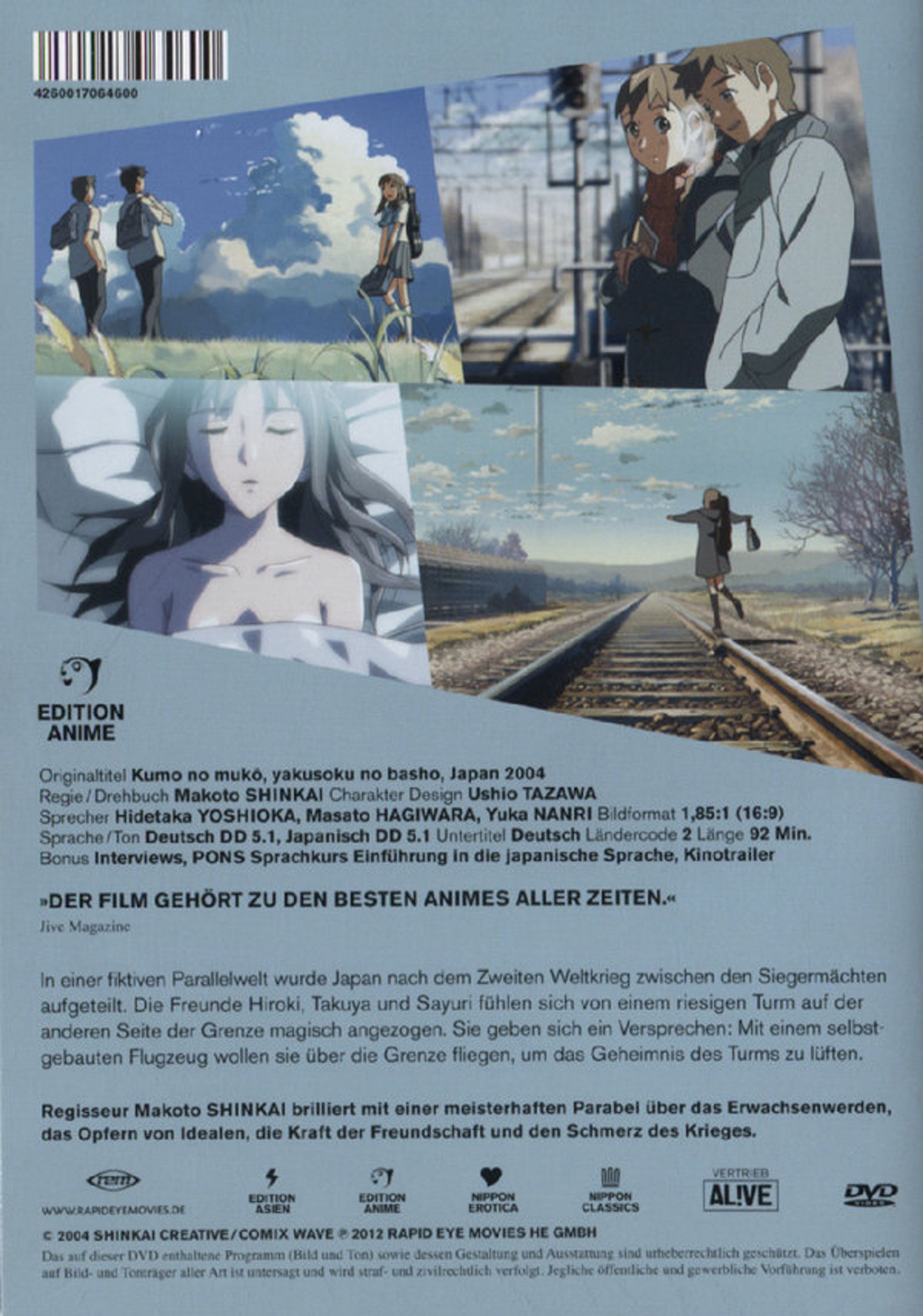 Film-Dienst: "Gestalterisch traditioneller Zeichentrickfilm, der virtuos Romanze, Abenteuerfilm und anspruchsvolle Science Fiction zu einer verstörenden Geschichte mit gedanklichem Tiefgang verbindet."Mehr von Makoto Shinkai