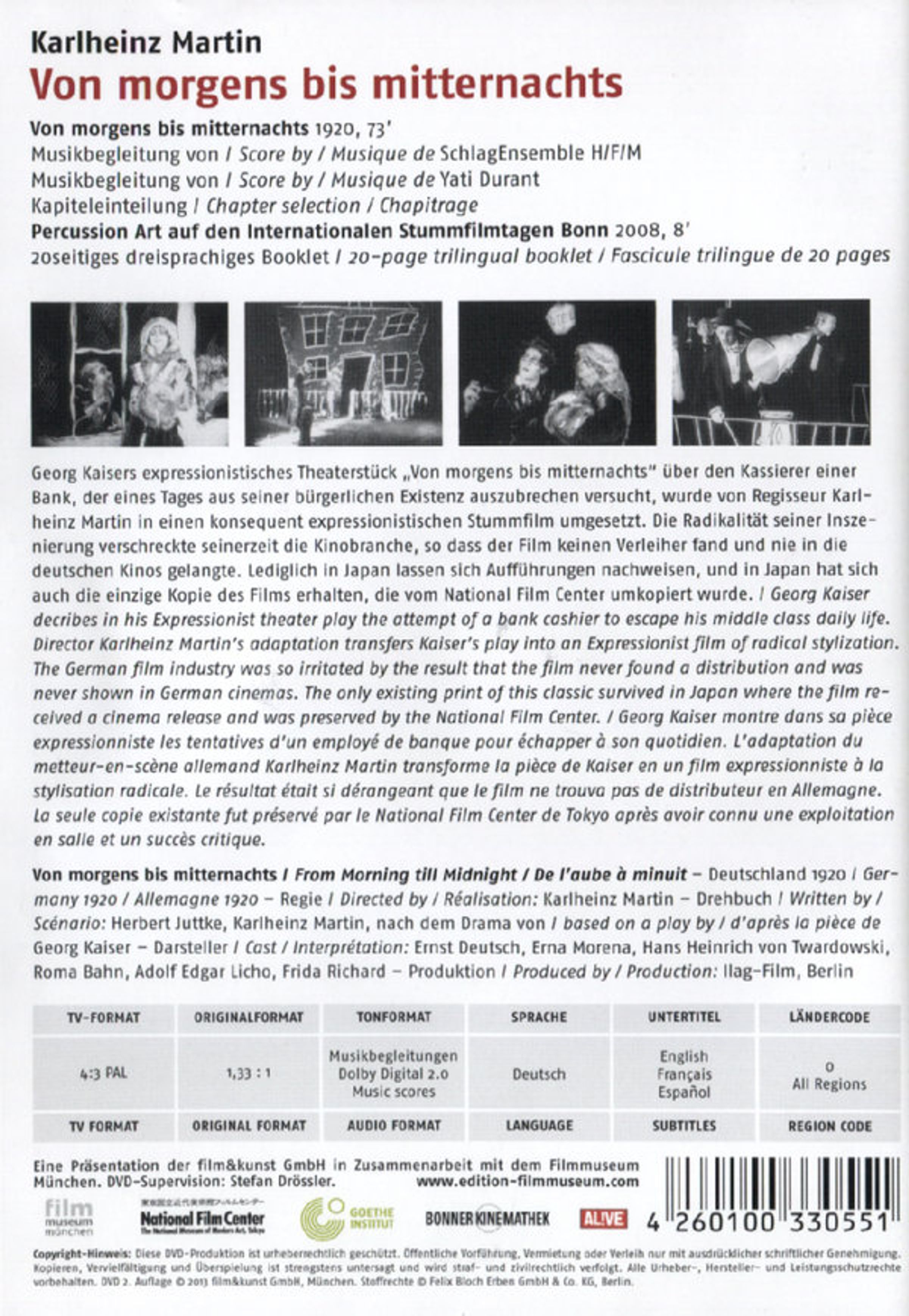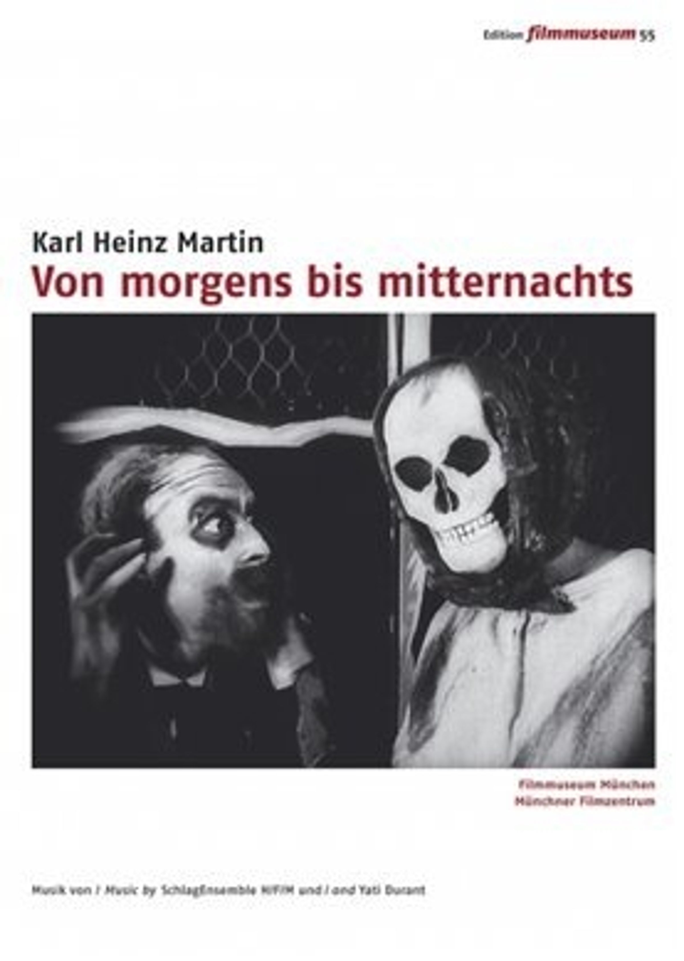 Georg Kaisers expressionistisches Theaterstück "Von morgens bis mitternachts" über den Kassierer einer Bank, der eines Tages aus seiner bürgerlichen Existenz auszubrechen versucht, wurde von Regisseur Karlheinz Martin in einen konsequent expressionistischen Stummfilm umgesetzt. Die Radikalität seiner Inszenierung verschreckte seinerzeit die Kinobranche, so dass der Film keinen Verleiher fand und nie in die deutschen Kinos gelangte. Lediglich in Japan lassen sich Aufführungen nachweisen, und in Japan hat sich auch die einzige Kopie des Films erhalten, die vom National Film Center umkopiert wurde. Das Filmmuseum München hat den Film restauriert, das SchlagEnsemble H/F/M und der Komponist Yati Durant haben für den Film zwei Musikbegleitungen erarbeitet, die die Gestaltungsmittel des Films aufgreifen und weiterführen.