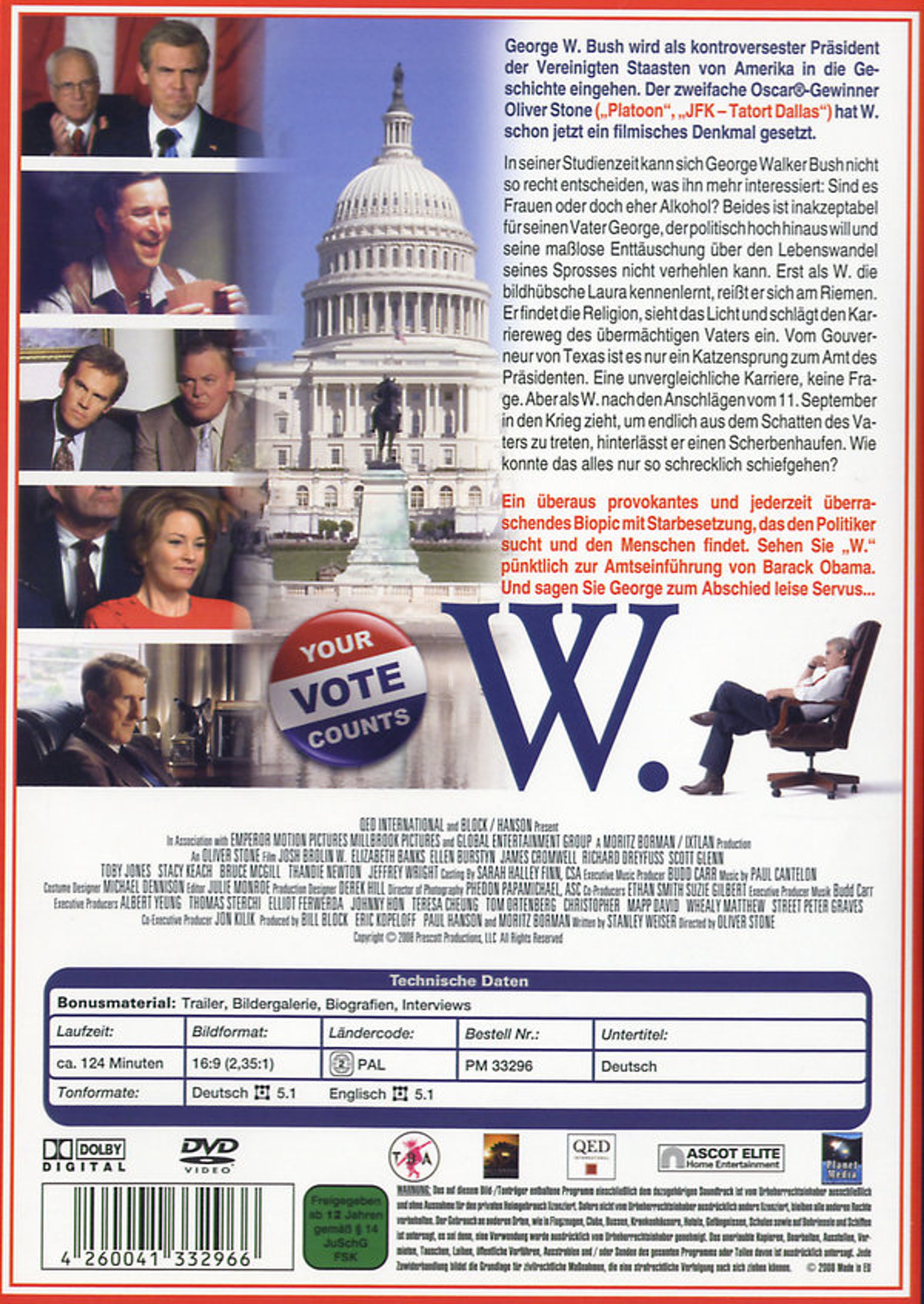 George W. Bush wird als kontroversester Präsident der Vereinigten Staasten von Amerika in die Geschichte eingehen. Der zweifache Oscar®-Gewinner Oliver Stone ("Platoon", "JFK – Tatort Dallas") hat W. schon jetzt ein filmisches Denkmal gesetzt.