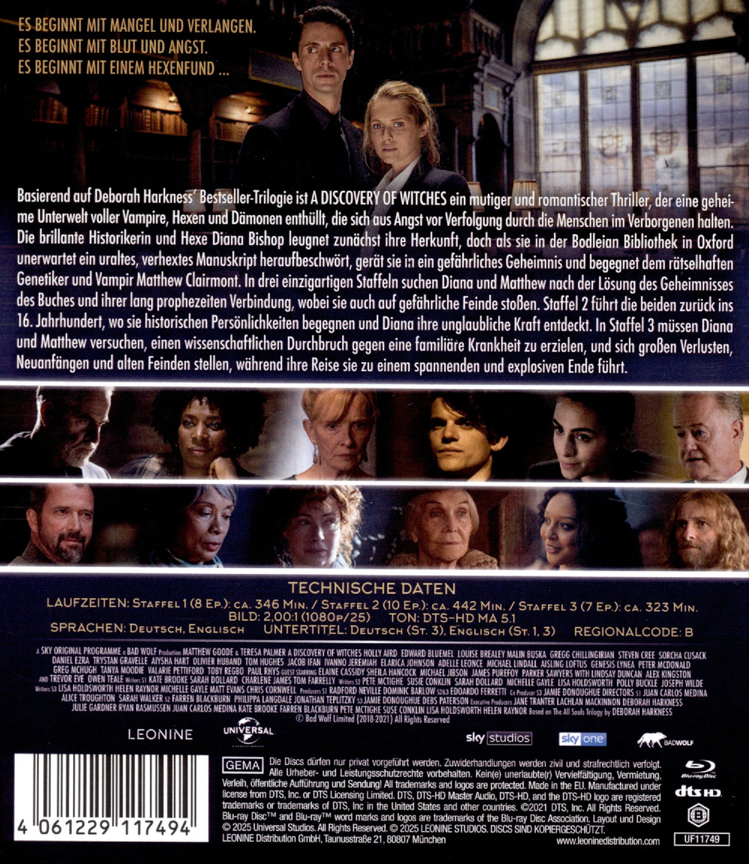 Basierend auf Deborah Harkness' Bestseller-Trilogie ist A DISCOVERY OF WITCHES ein mutiger und romantischer Thriller, der eine geheime Unterwelt voller Vampire, Hexen und Dämonen enthüllt, die sich aus Angst vor Verfolgung durch die Menschen im Verborgenen halten. Die brillante Historikerin und Hexe Diana Bishop leugnet zunächst ihre Herkunft, doch als sie in der Bodleian Bibliothek in Oxford unerwartet ein uraltes, verhextes Manuskript heraufbeschwört, gerät sie in ein gefährliches Geheimnis und begegnet dem rätselhaften Genetiker und Vampir Matthew Clairmont. In drei einzigartigen Staffeln suchen Diana und Matthew nach der Lösung des Geheimnisses des Buches und ihrer lang prophezeiten Verbindung, wobei sie auch auf gefährliche Feinde stoßen. Staffel 2 führt die beiden zurück ins 16. Jahrhundert, wo sie historischen Persönlichkeiten begegnen und Diana ihre unglaubliche Kraft entdeckt. In Staffel 3 müssen Diana und Matthew versuchen, einen wissenschaftlichen Durchbruch gegen eine familiäre Krankheit zu erzielen, und sich großen Verlusten, Neuanfängen und alten Feinden stellen, während ihre Reise sie zu einem spannenden und explosiven Ende führt.