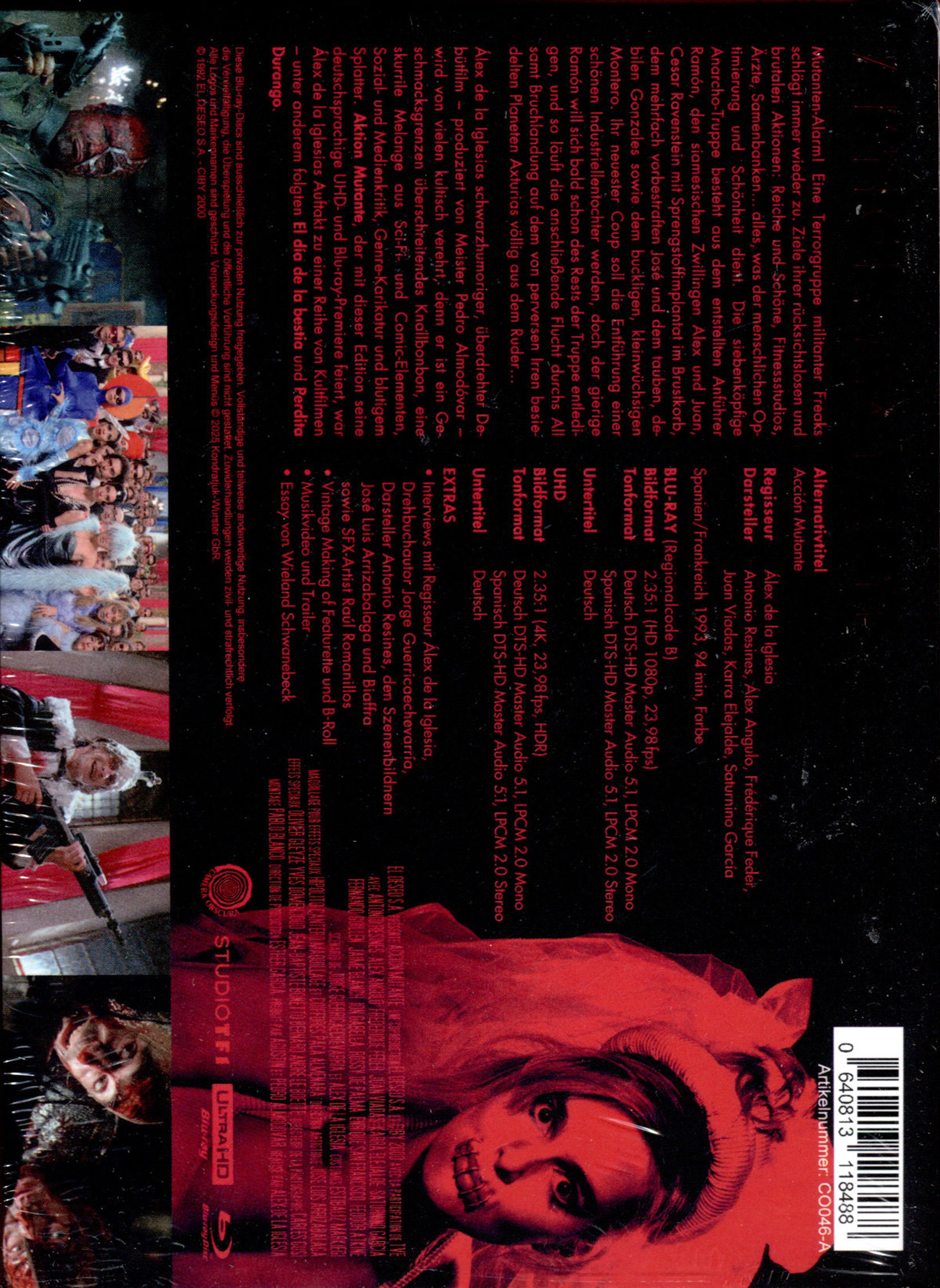 Álex de la Iglesias schwarzhumoriger, überdrehter Debütfilm - produziert von Meister Pedro Almodóvar - wird von vielen kultisch verehrt, denn er ist ein Geschmacksgrenzen überschreitendes Knallbonbon, eine skurrile Melange aus Sci-Fi- und Comic-Elementen, Sozial- und Medienkritik, Genre-Karikatur und blutigem Splatter. AKTION MUTANTE, der mit dieser Edition seine deutschsprachige UHD- und Blu-ray-Premiere feiert, war Álex de la Iglesias Auftakt zu einer Reihe von Kultfilmen - unter anderem folgten EL DÍA DE LA BESTIA und PERDITA DURANGO.