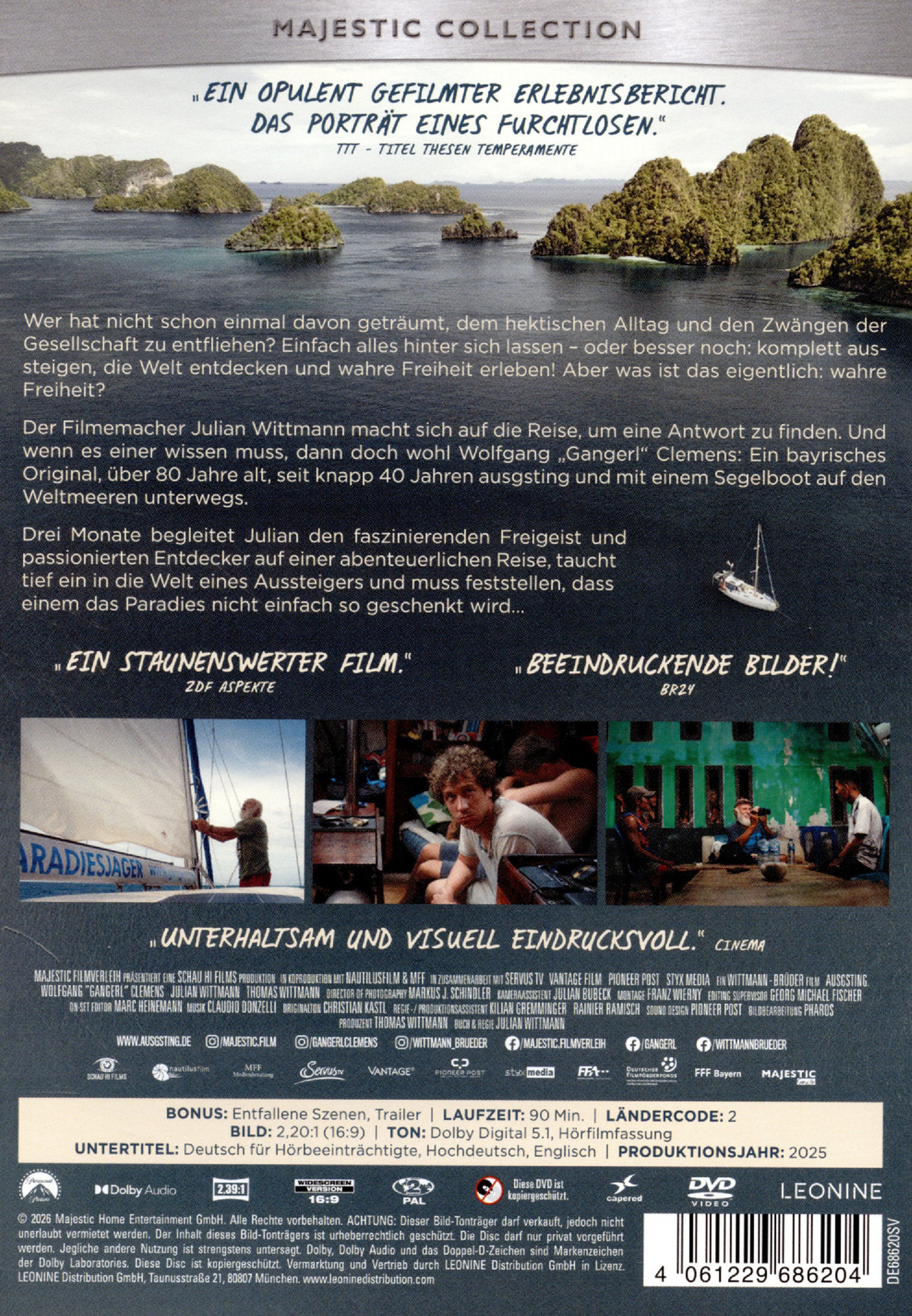 Der Filmemacher Julian Wittmann macht sich auf die Reise, um eine Antwort zu finden. Und wenn es einer wissen muss, dann doch wohl Wolfgang »Gangerl« Clemens: Ein bayrisches Original, über 80 Jahre alt, seit knapp 40 Jahren ausgsting und mit einem Segelboot auf den Weltmeeren unterwegs. Drei Monate begleitet Julian den faszinierenden Freigeist und passionierten Entdecker auf einer abenteuerlichen Reise, taucht tief ein in die Welt eines Aussteigers und muss feststellen, dass einem das Paradies nicht einfach so geschenkt wird...