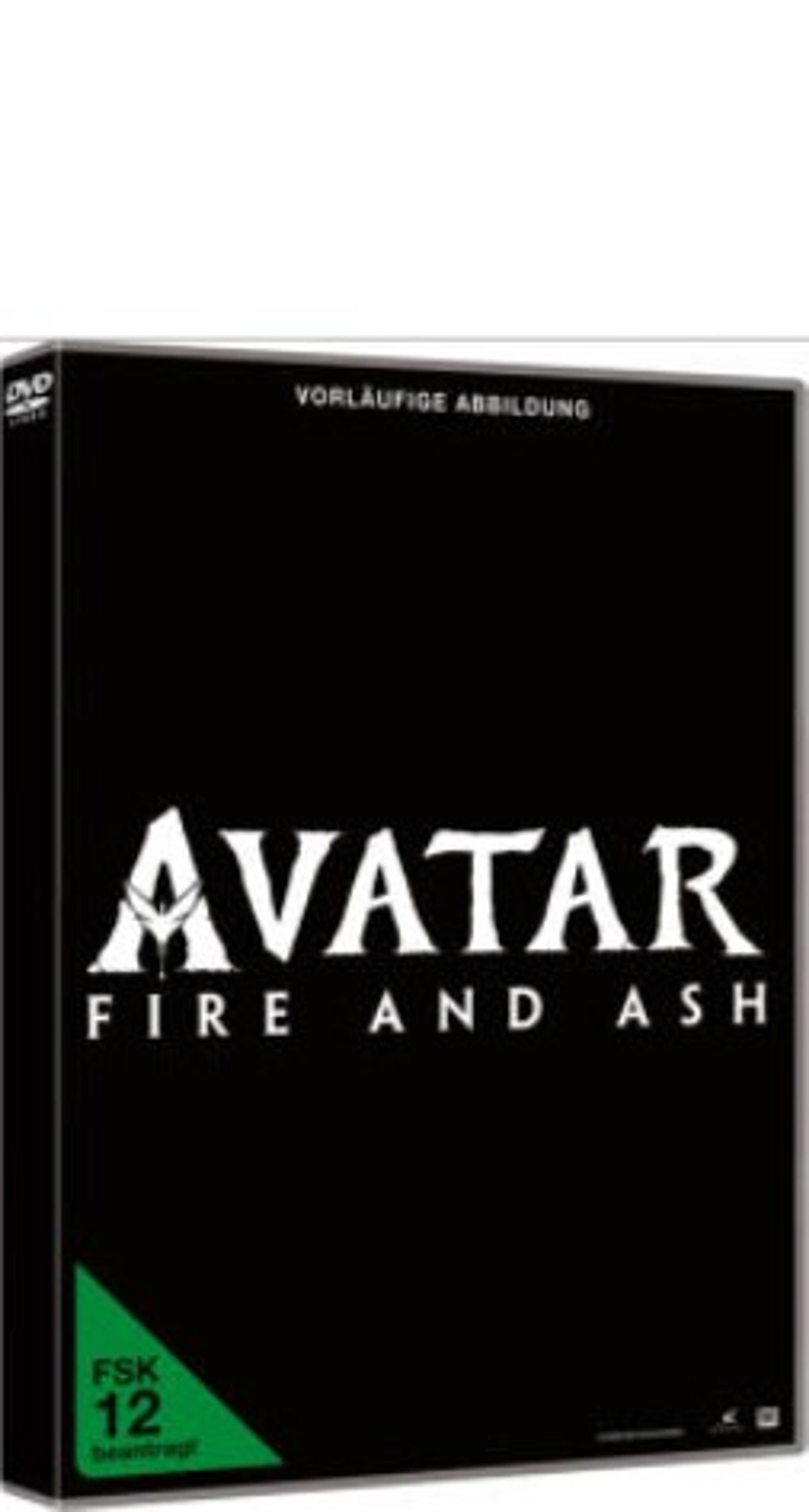 Text "Vorläufige Abbildung" oben, "AVATAR FIRE AND ASH" zentral, "FSK 12" unten. Schwarzer Hintergrund, DVD-Hülle., DVD