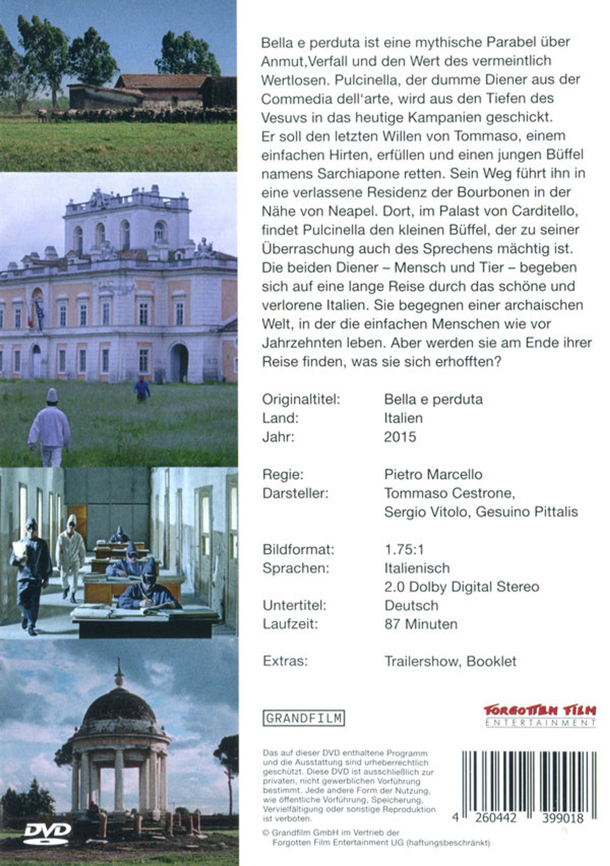 BELLA E PERDUTA ist eine mythische Parabel über Anmut, Verfall und den Wert des vermeintlich Wertlosen. Pulcinella, der dumme Diener aus der Commedia dell’arte, wird aus den Tiefen des Vesuvs in das heutige Kampanien geschickt. Er soll den letzten Willen von Tommaso, einem einfachen Hirten, erfüllen und einen jungen Büffel namens Sarchiapone retten. Sein Weg führt ihn in eine verlassene Residenz der Bourbonen in der Nähe von Neapel. Dort, im Palast von Carditello, findet Pulcinella den kleinen Büffel, der zu seiner Überraschung auch des Sprechens mächtig ist. Die beiden Diener - Mensch und Tier - begeben sich auf eine lange Reise durch das schöne und verlorene Italien. Sie begegnen einer archaischen Welt, in der die einfachen Menschen wie vor Jahrzehnten leben. Aber werden sie am Ende ihrer Reise finden, was sie sich erhofften?