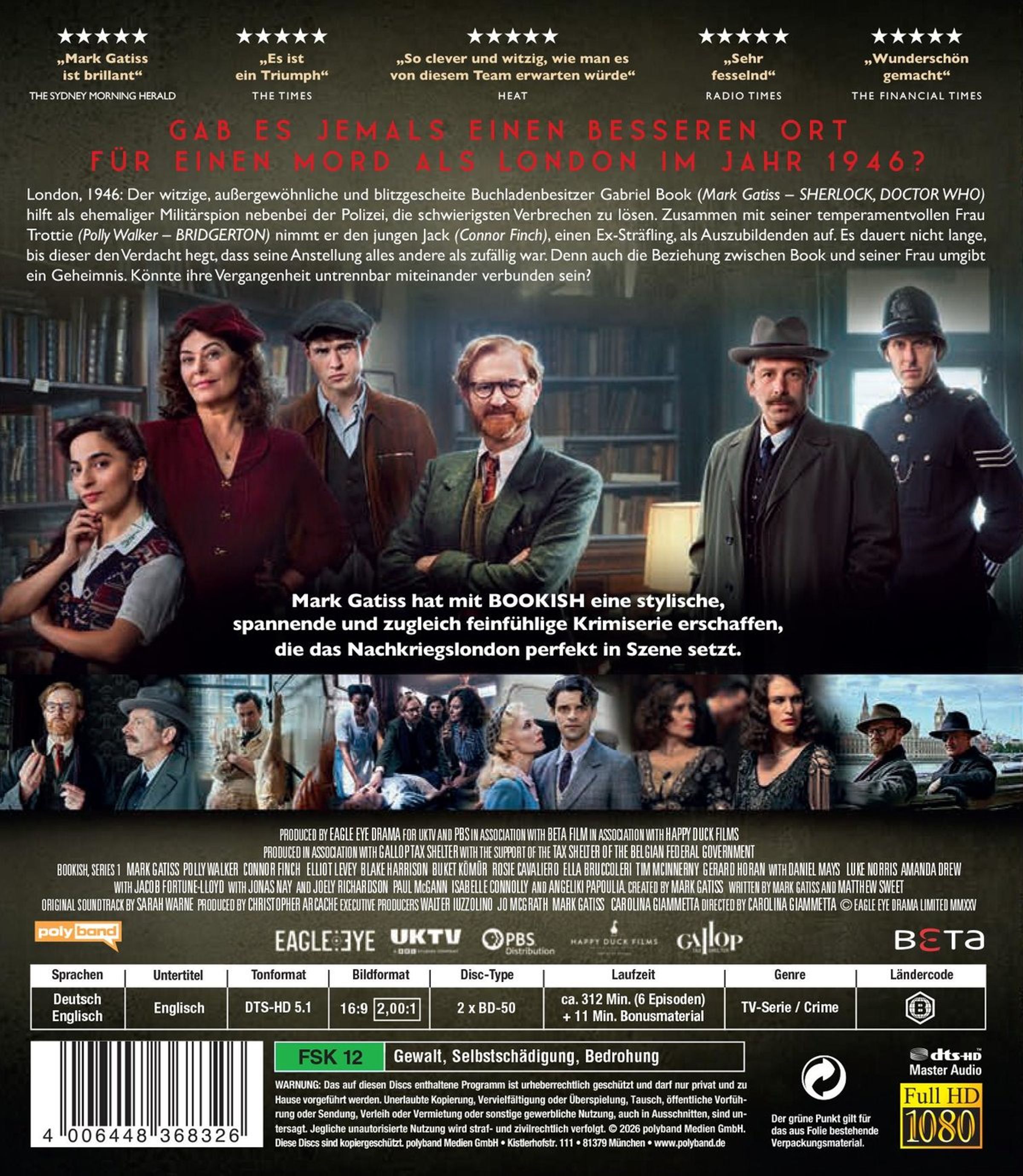 Mark Gatiss (kreativer Kopf und Darsteller der BBC-Hitserie »Sherlock«) hat mit Bookish eine stylische, spannende und zugleich feinfühlige Krimiserie erschaffen, die das Nachkriegslondon perfekt in Szene setzt.