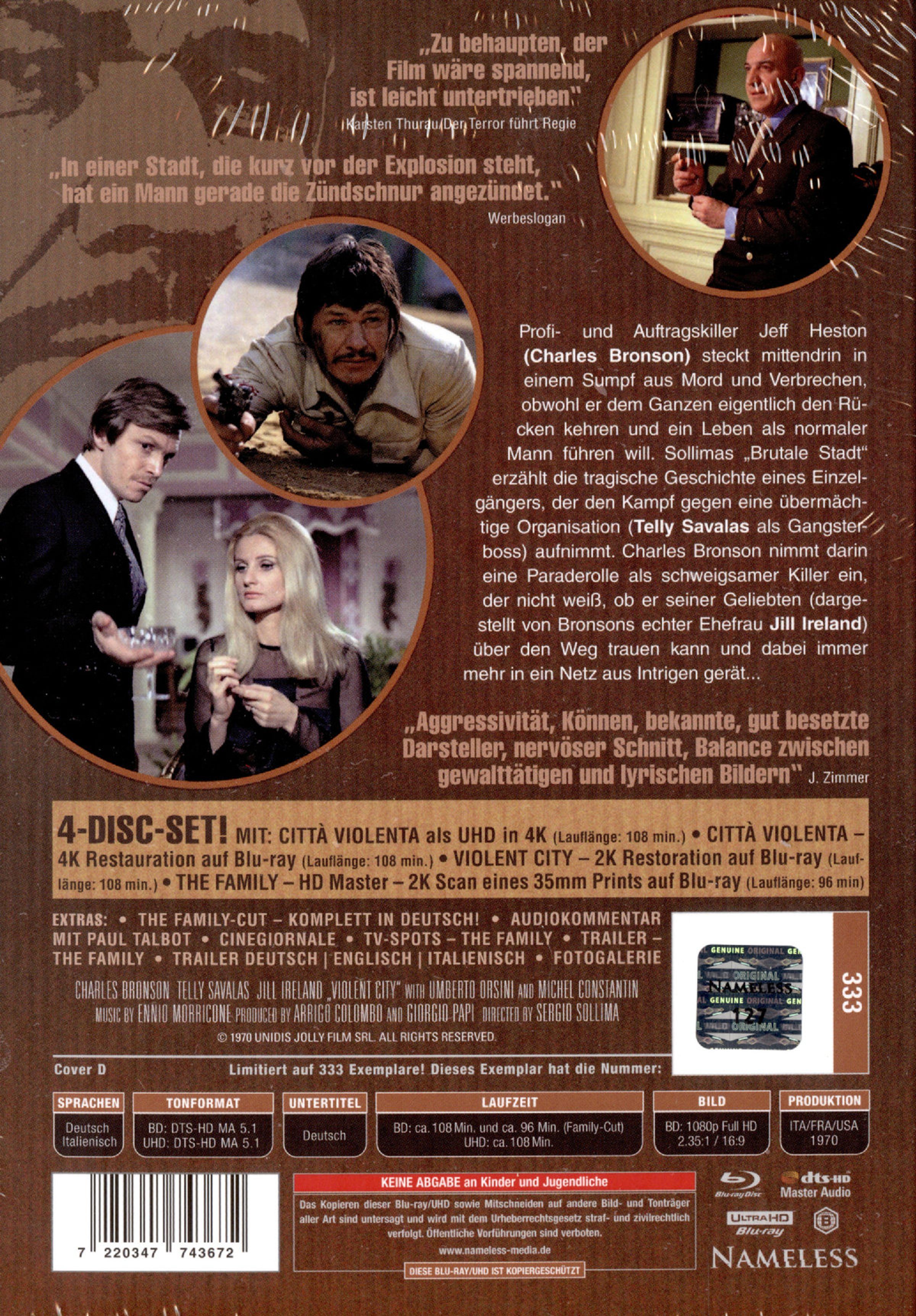 Sollimas »Brutale Stadt« erzählt die tragische Geschichte eines Einzelgängers, der den Kampf gegen eine übermächtige Organisation aufnimmt. Charles Bronson nimmt darin eine Paraderolle als schweigsamer Killer ein, der nicht weiß, ob er seiner Geliebten über den Weg trauen kann und dabei immer mehr in ein