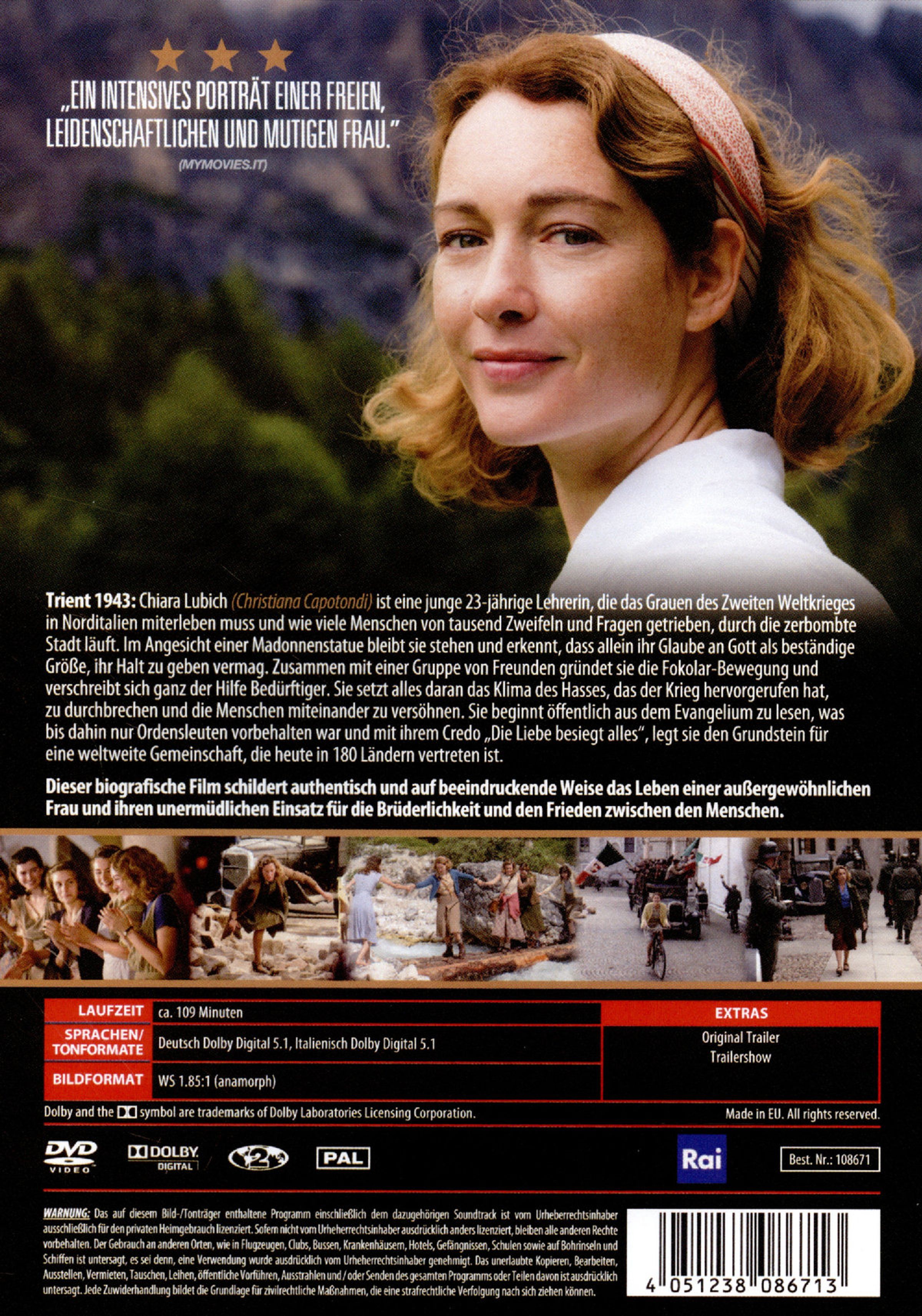 Trient 1943: Chiara Lubich ist eine junge 23-jährige Lehrerin, die das Grauen des Zweiten Weltkrieges in Norditalien miterleben muss und wie viele Menschen von tausend Zweifeln und Fragen getrieben, durch die zerbombte Stadt läuft. Im Angesicht einer Madonnenstatue bleibt sie stehen und erkennt, dass allein ihr Glaube an Gott als beständige Größe, ihr Halt zu geben vermag. Zusammen mit einer Gruppe von Freunden gründet sie die Fokolar-Bewegung und verschreibt sich ganz der Hilfe Bedürftiger. Sie setzt alles daran das Klima des Hasses, das der Krieg hervorgerufen hat, zu durchbrechen und die Menschen miteinander zu versöhnen. Sie beginnt öffentlich aus dem Evangelium zu lesen, was bis dahin nur Ordensleuten vorbehalten war und mit ihrem Credo »Die Liebe besiegt alles«, legt sie den Grundstein für eine weltweite Gemeinschaft, die heute in 180 Ländern vertreten ist.