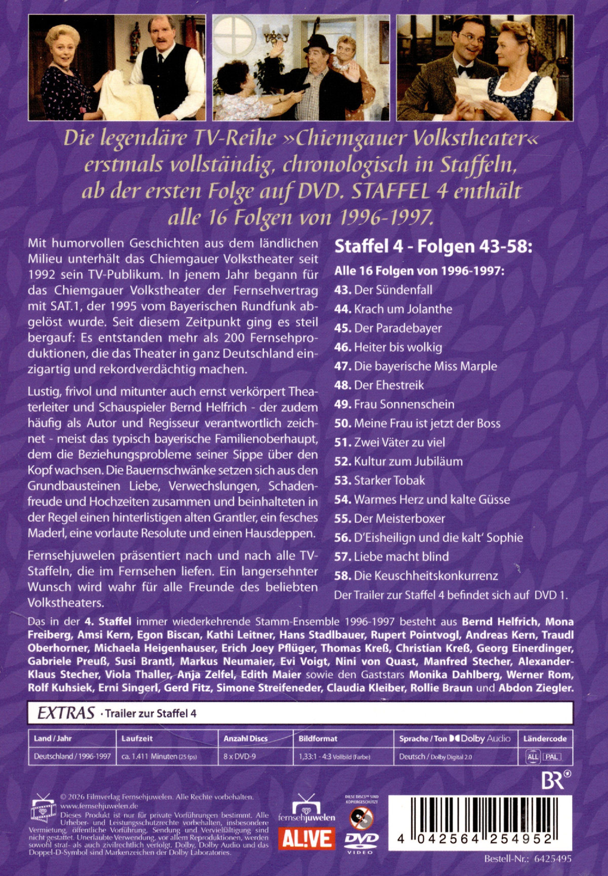 Das in der 4. Staffel spielende Ensemble der Jahre 1996-1997 besteht aus Bernd Helfrich, Mona Freiberg-Helfrich, Amsi Kern, Hans Stadlbauer, Egon Biscan, Michaela Heigenhauser, Rupert Pointvogl, Kathi Leitner, Georg Einerdinger, Andreas Kern, Erich J. Pflüger, Monika Dahlberg, Traudl Oberhorner, Werner Rom, Erni Singerl, Markus Neumaier, Evi Voigt, Susi Brantl, Gabriele Preuß, Christian Kreß, Nini von Quast, Alexander-Klaus Stecher, Rolf Kuhsiek, Viola Thaller, Simone Streifeneder, Claudia Kleiber, Abdon Ziegler, Anja Zelfel, Rollie Braun, Edith Maier und Gerd Fitz. Fernsehjuwelen präsentiert nach und nach alle TV-Staffeln, die im Fernsehen liefen. Ein langersehnter Wunsch wird wahr für alle Freunde des beliebten Volkstheaters.