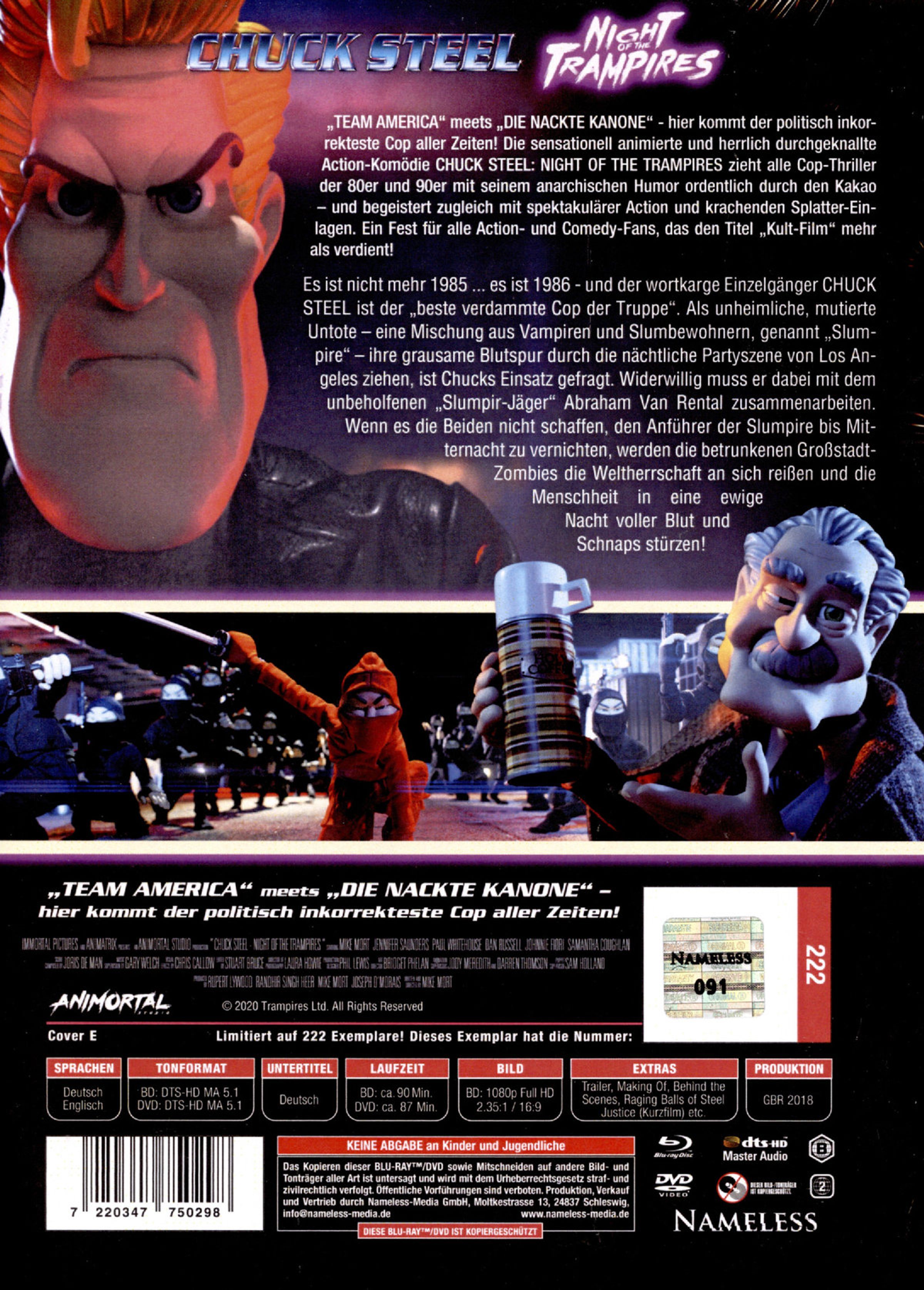 Die sensationell animierte und herrlich durchgeknallte Action-Komödie CHUCK STEEL: NIGHT OF THE TRAMPIRES zieht alle Cop-Thriller der 80er und 90er mit seinem anarchischen Humor ordentlich durch den Kakao - und begeistert zugleich mit spektakulärer Action und krachenden Splatter-Einlagen. Ein Fest für alle Action- und Comedy-Fans, das den Titel »Kult-Film« mehr als verdient!