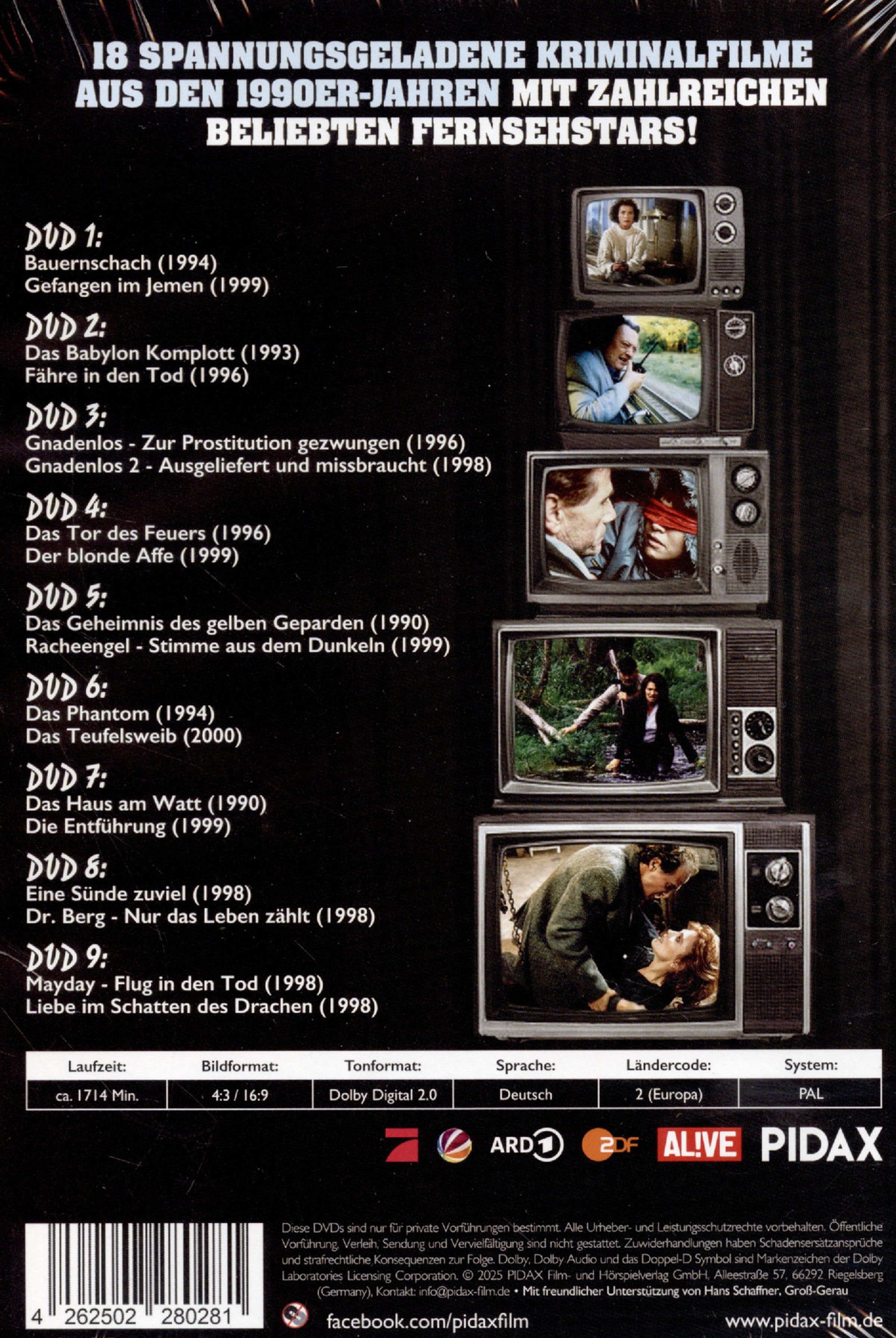 Nach den 1950er- und 1960er-Jahren sowie den 1970er- und 1980er-Jahren, widmet sich die dritte DVD-Box des großen Krimi-Archivs nun den 90ern und somit auch erstmals dem Privatfernsehen. Enthalten sind 18 weitere hochspannende Kriminalfälle mit einer herausragenden Besetzung: Erleben Sie diesmal actiongeladene Krimikost mit Schimanski Götz George in drei verschiedenen Rollen sowie weitere beliebte Kult-Ermittler wie Iris Berben (Rosa Roth), Dieter Pfaff (Der Dicke, Bloch) oder Hannelore Elsner (Die Kommissarin)!