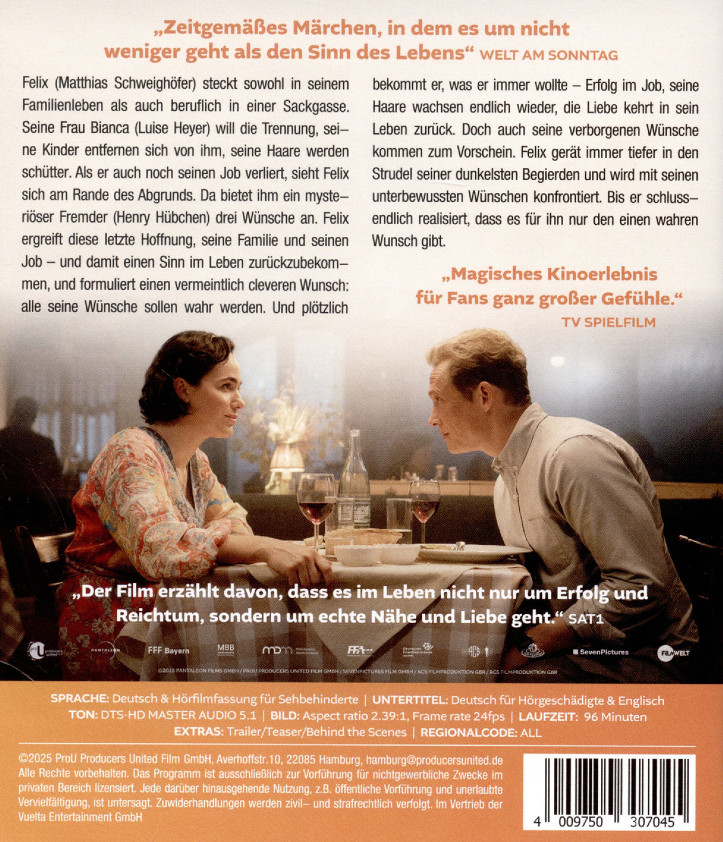 Felix steckt sowohl in seinem Familienleben als auch beruflich in einer Sackgasse. Seine Frau Bianca will die Trennung, seine Kinder entfernen sich von ihm, seine Haare werden schütter. Als er auch noch seinen Job verliert, sieht Felix sich am Rande des Abgrunds. Da bietet ihm ein mysteriöser Fremder drei Wünsche an. Felix ergreift diese letzte Hoffnung, seine Familie und seinen Job - und damit einen Sinn im Leben zurückzubekommen, und formuliert einen vermeintlich cleveren Wunsch: alle seine Wünsche sollen wahr werden. Und plötzlich bekommt er, was er immer wollte - Erfolg im Job, seine Haare wachsen endlich wieder, die Liebe kehrt in sein Leben zurück. Doch auch seine verborgenen Wünsche kommen zum Vorschein. Felix gerät immer tiefer in den Strudel seiner dunkelsten Begierden und wird mit seinen unterbewussten Wünschen konfrontiert. Bis er schlussendlich realisiert, dass es für ihn nur den einen wahren Wunsch gibt.