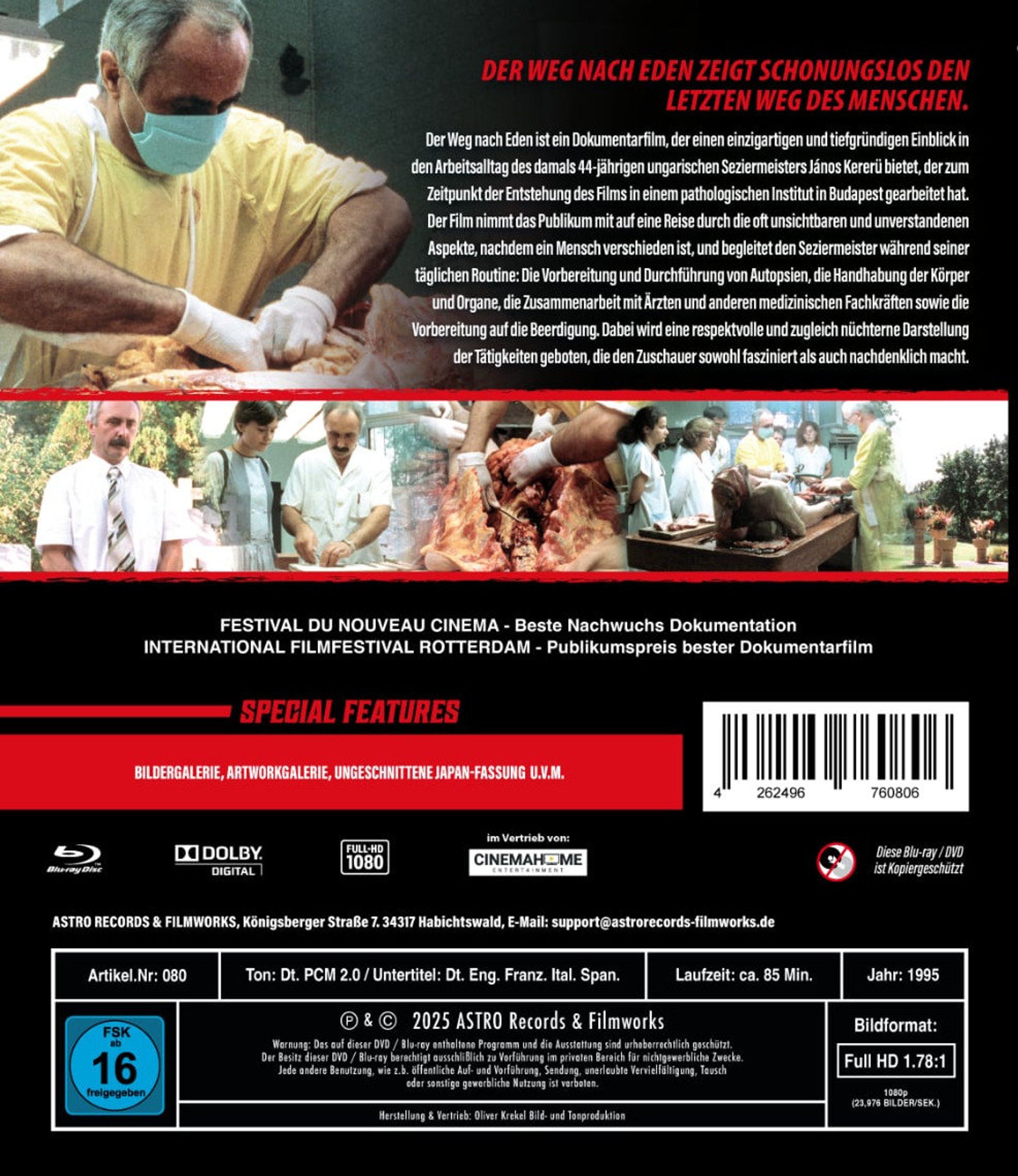 Der Weg nach Eden ist ein Dokumentarfilm, der einen einzigartigen und tiefgründigen Einblick in den Arbeitsalltag des damals 44-jährigen ungarischen Seziermeisters Janos Kererü bietet, der zm Zeitpunkt der Entstehung des Films in einem pathologischen Institut in Budapest gearbeitet hat. Der Film nimmt das Publikum mit auf eine Reise durch die oft unslichbren und unverstandenen Aspekte, nachdem ein Mensch verschieden ist, und begleitet den Seziermeister während seiner täglichen Routine...