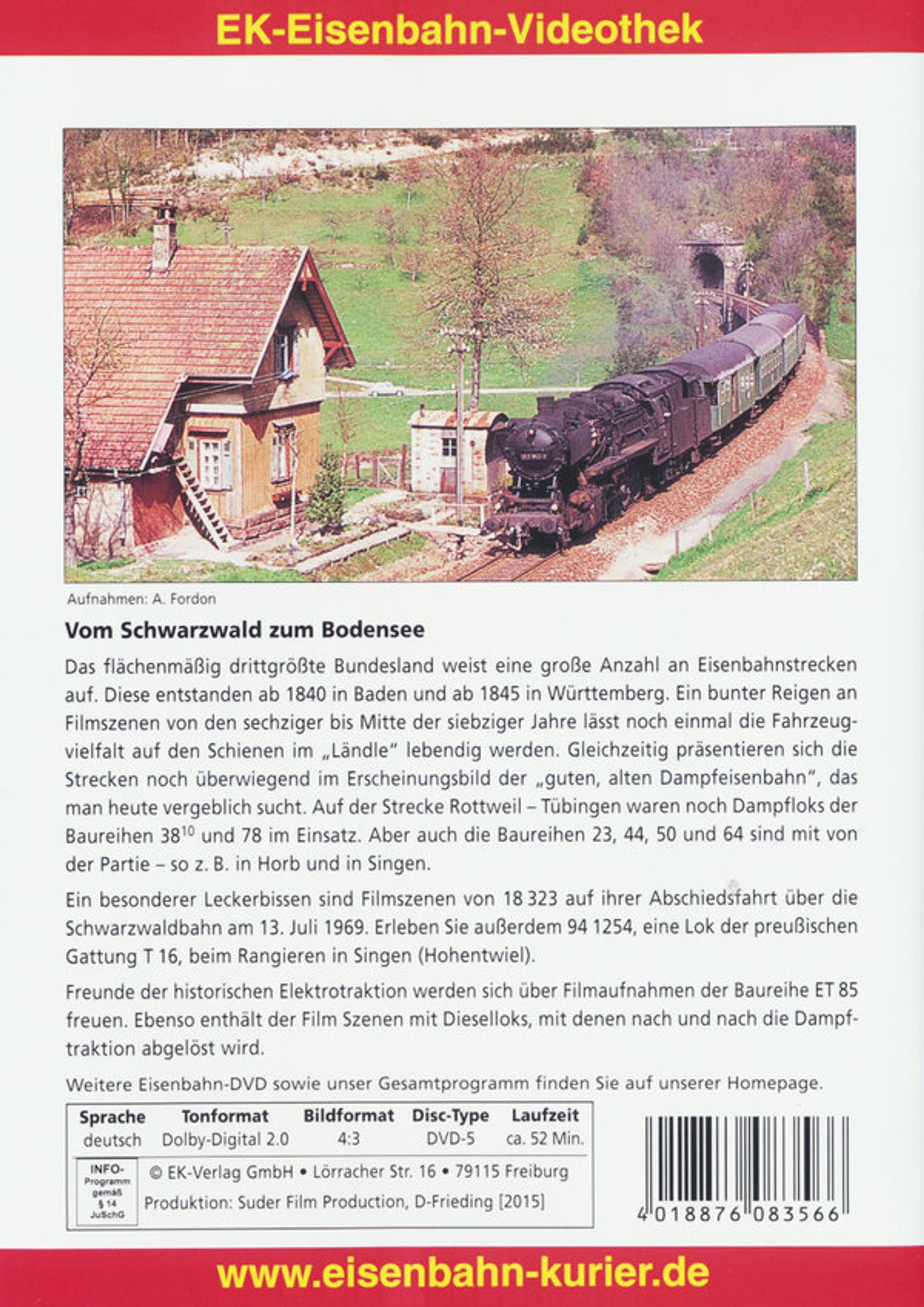 Das flächenmäßig drittgrößte Bundesland weist eine große Anzahl an Eisenbahnstrecken auf. Diese entstanden ab 1840 in Baden und ab 1845 in Württemberg. Ein bunter Reigen an Filmszenen von den sechziger bis Mitte der siebziger Jahre lässt noch einmal die Fahrzeugvielfalt auf den Schienen im „Ländle" lebendig werden. Gleichzeitig präsentieren sich die Strecken noch überwiegend im Erscheinungsbild der „guten, alten Dampfeisenbahn", das man heute vergeblich sucht. Auf der Strecke Rottweil - Tübingen waren noch Dampfloks der Baureihen 3810 und 78 im Einsatz. Aber auch die Baureihen 23, 44, 50 und 64 sind mit von der Partie - so z. B. in Horb und in Singen.