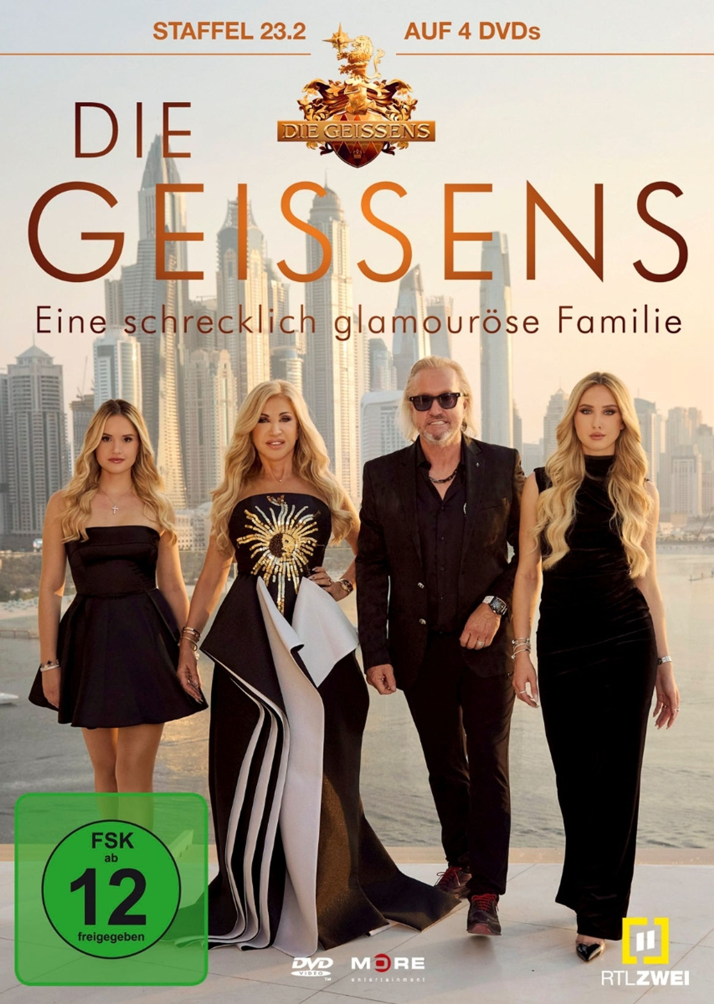 Text: "STAFFEL 23.2 AUF 4 DVDs, DIE GEISSENS, Eine schrecklich glamouröse Familie, FSK ab 12 freigegeben". Vier elegant gekleidete Personen vor einer Skyline., 4 DVDs