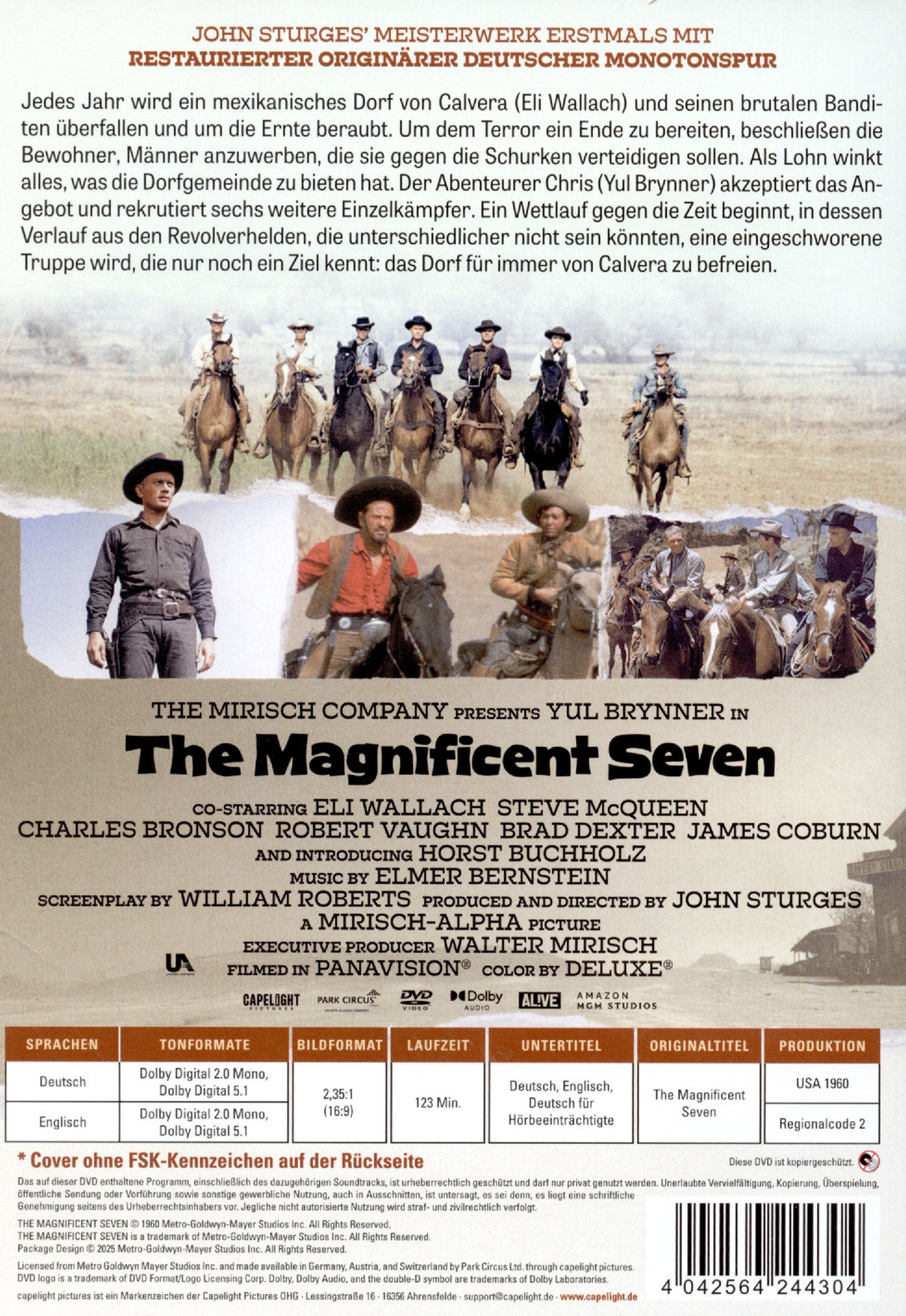 Jedes Jahr wird ein mexikanisches Dorf von Calvera und seinen brutalen Banditen überfallen und um die Ernte beraubt. Um dem Terror ein Ende zu bereiten, beschließen die Bewohner, Männer anzuwerben, die sie gegen die Schurken verteidigen sollen. Als Lohn winkt alles, was die Dorfgemeinde zu bieten hat. Der Abenteurer Chris akzeptiert das Angebot und rekrutiert sechs weitere Einzelkämpfer. Ein Wettlauf gegen die Zeit beginnt, in dessen Verlauf aus den Revolverhelden, die unterschiedlicher nicht sein könnten, eine eingeschworene Truppe wird, die nur noch ein Ziel kennt: das Dorf für immer von Calvera zu befreien.