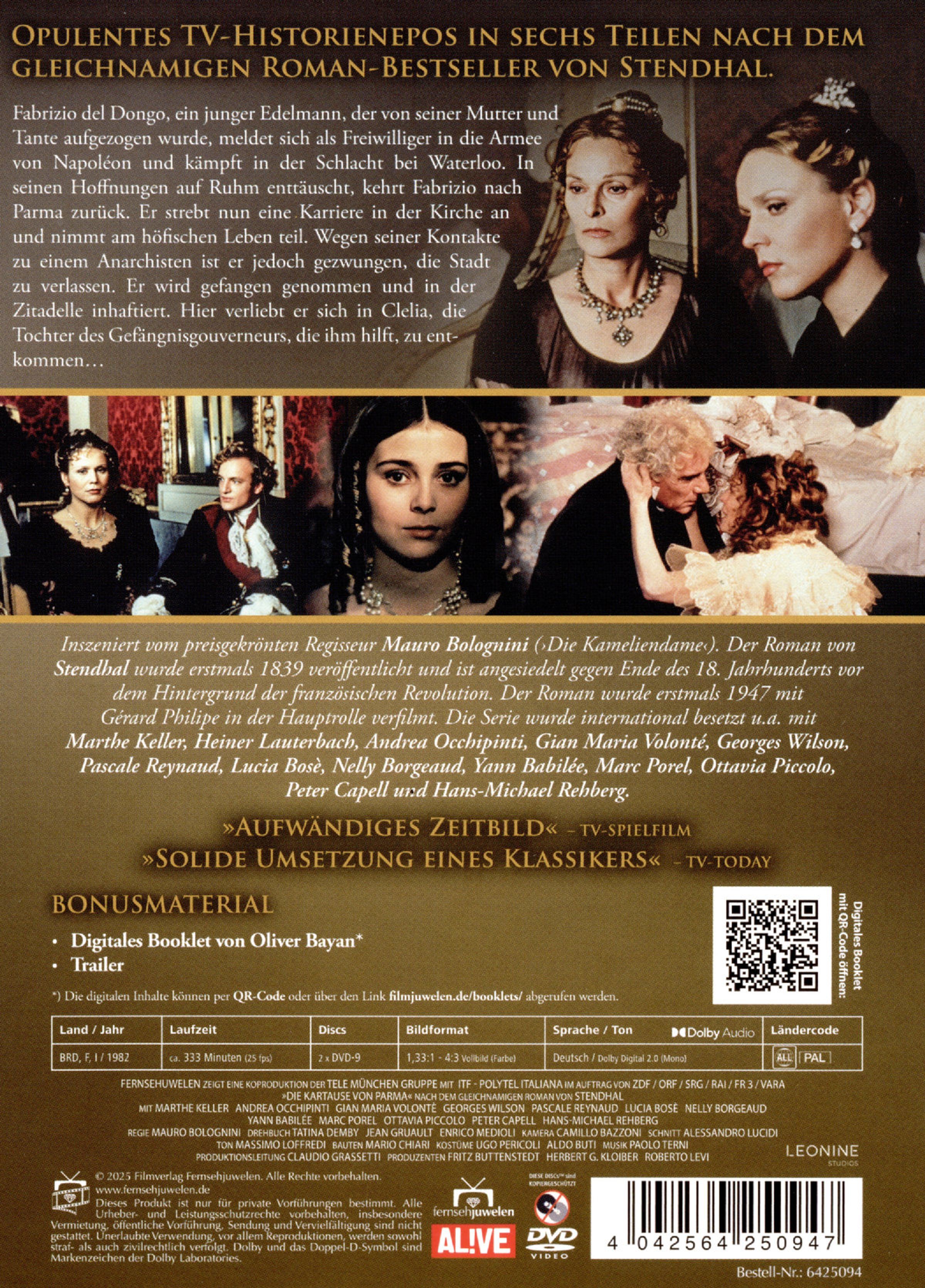 Vor dem Hintergrund der französischen Revolution und ihren Auswirkungen erzählt dieser Sechsteiler nach dem berühmten Roman Stendhals die Geschichte des jungen Fabrizio del Dongo, eines glühenden Bewunderers Napoleons, der zunächst in die Armee eintritt, verwundet wird und nach seinem Studium als Monsignore in die Stadt seiner Träume - nach Parma - gelangt. Weil er sein Gelübde noch nicht abgelegt hat, mangelt es ihm nicht an Damenbekanntschaften. Dies bringt ihm den Ärger eines verschmähten Rivalen ein, und so wird ein Attentat auf ihn verübt. Sein alter Lehrer, den er auf einer Erholungsreise trifft, sagt ihm indessen eine dunkle Zukunft voraus. Sein Bestreben, diese nicht eintreffen zu lassen, beschwört das Unheil jedoch geradezu herauf. In einem Kampf tötet Fabrizio seinen Erzfeind und wird nach einiger Zeit der Flucht in der Zitadelle von Parma inhaftiert, wo er Clelia kennen lernt, in die er sich verliebt. Sie schenkt ihm einen Sohn, der jedoch an Krankheit stirbt. Dies zieht auch den Tod der Mutter nach sich. Im Alter zieht Fabrizio sich schließlich in die Kartause, das Kloster von Parma, zurück, um auf seinen Tod zu warten.