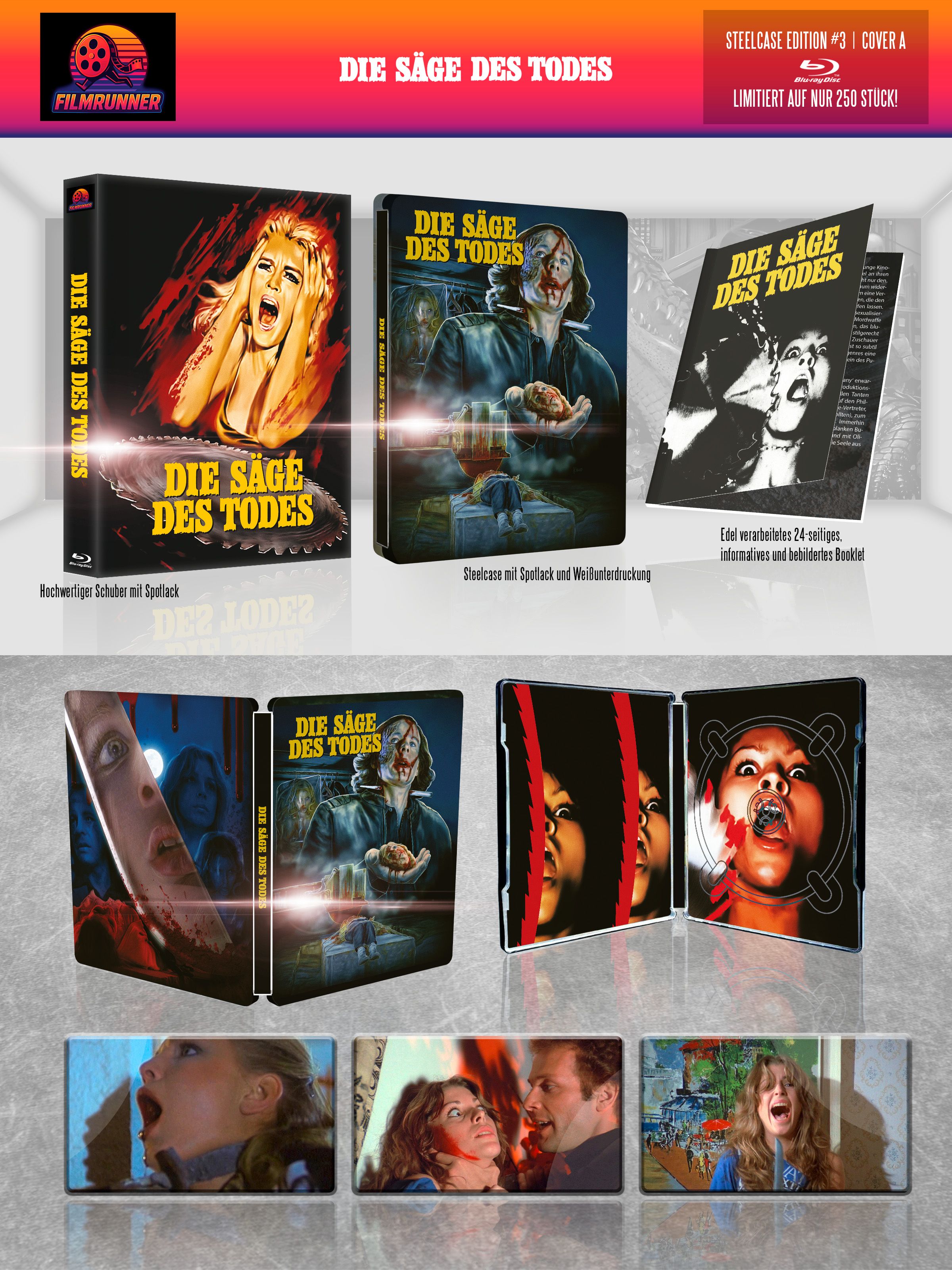 "Die Säge des Todes" steht in gelben Buchstaben auf einem schwarzen Hintergrund. Eine schreiende Frau umgeben von roten Flecken., Blu-ray Disc