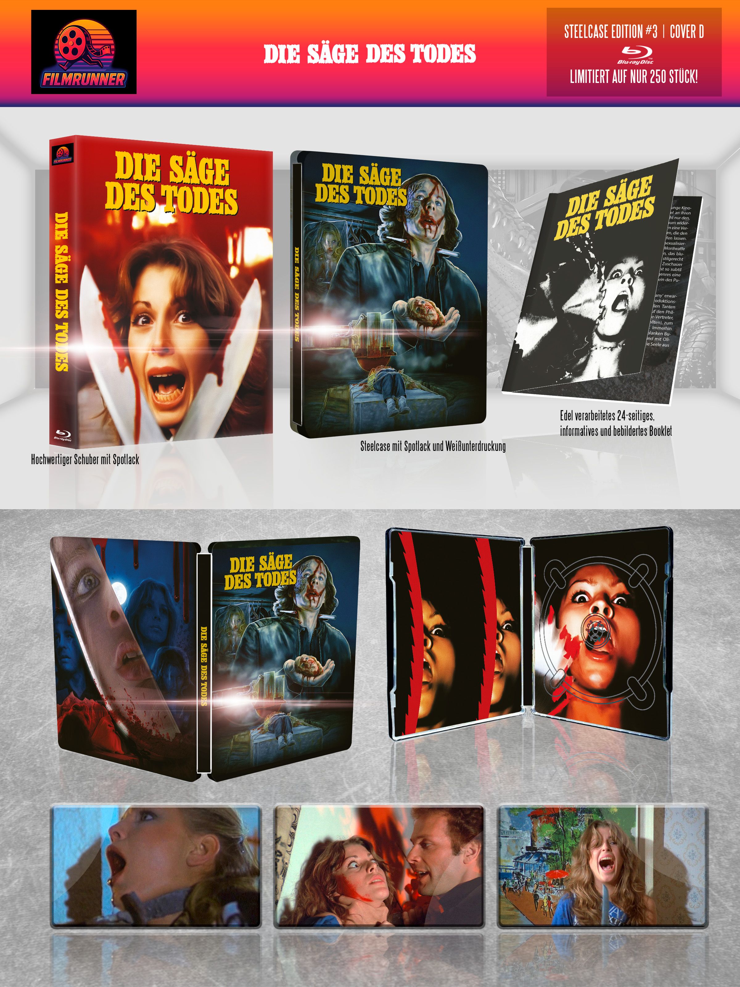 "DIE SÄGE DES TODES" in gelber Schrift auf rotem Hintergrund. Frau schreit, hält zwei blutige Klingen., Blu-ray Disc