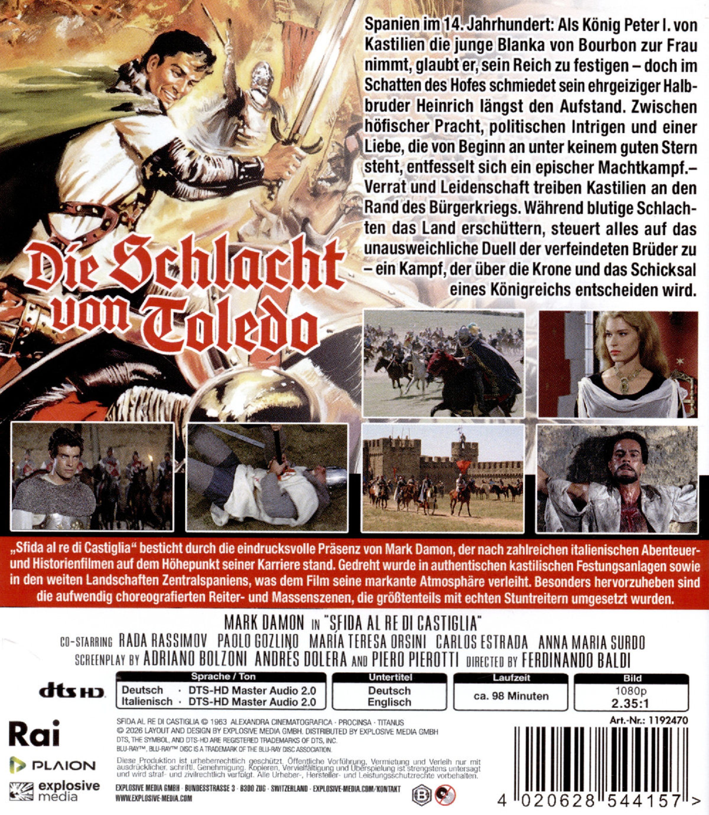 »Die Schlacht von Toledo« ist ein mitreißendes Historiendrama voller Machtkämpfe, Verrat und tragischer Liebe! Als König Peter I. von Kastilien Blanka von Bourbon heiraten will, ahnt er nicht, dass sein Halbbruder Heinrich bereits einen Aufstand plant. Zwischen höfischer Romantik und brutaler Rebellion entspinnt sich ein dramatischer Kampf um die Krone. Verrat, verbotene Liebe und blutige Schlachten treiben das Reich an den Rand des Abgrunds - bis zum entscheidenden Duell der Brüder. »Die Schlacht von Toledo« ist ein klassisches Historiendrama voller dramatischer Wendungen, edler Helden und königlicher Intrigen. Regisseur Ferdinando Baldi inszeniert die Geschichte mit viel Gespür für Spannung und Atmosphäre. Die prachtvollen Kostüme, eindrucksvollen Kulissen und packenden Fechtduelle verleihen dem Film zeitlosen Reiz. Besonders gelungen ist die Mischung aus romantischer Tragik und politischem Machtkampf, die dem Film emotionale Tiefe verleiht. Ein nostalgischer Leckerbissen für Fans des europäischen Abenteuerkinos der 1960er Jahre.