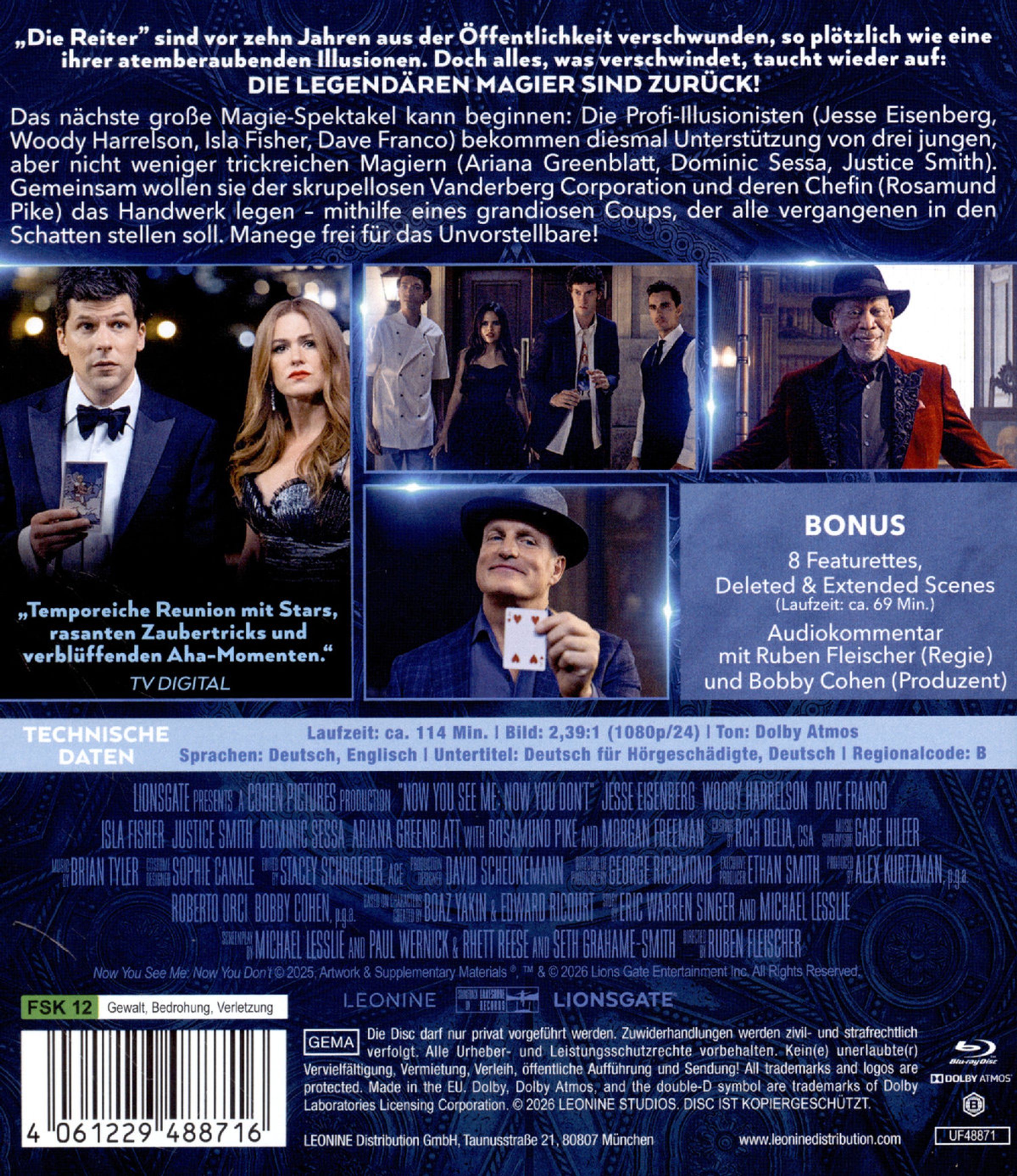 Das nächste große Magie-Spektakel kann beginnen: Die Profi-Illusionisten bekommen diesmal Unterstützung von drei jungen, aber nicht weniger trickreichen Magiern. Gemeinsam wollen sie der skrupellosen Vanderberg Corporation und deren Chefin das Handwerk legen - mithilfe eines grandiosen Coups, der alle vergangenen in den Schatten stellen soll. Manege frei für das Unvorstellbare!
