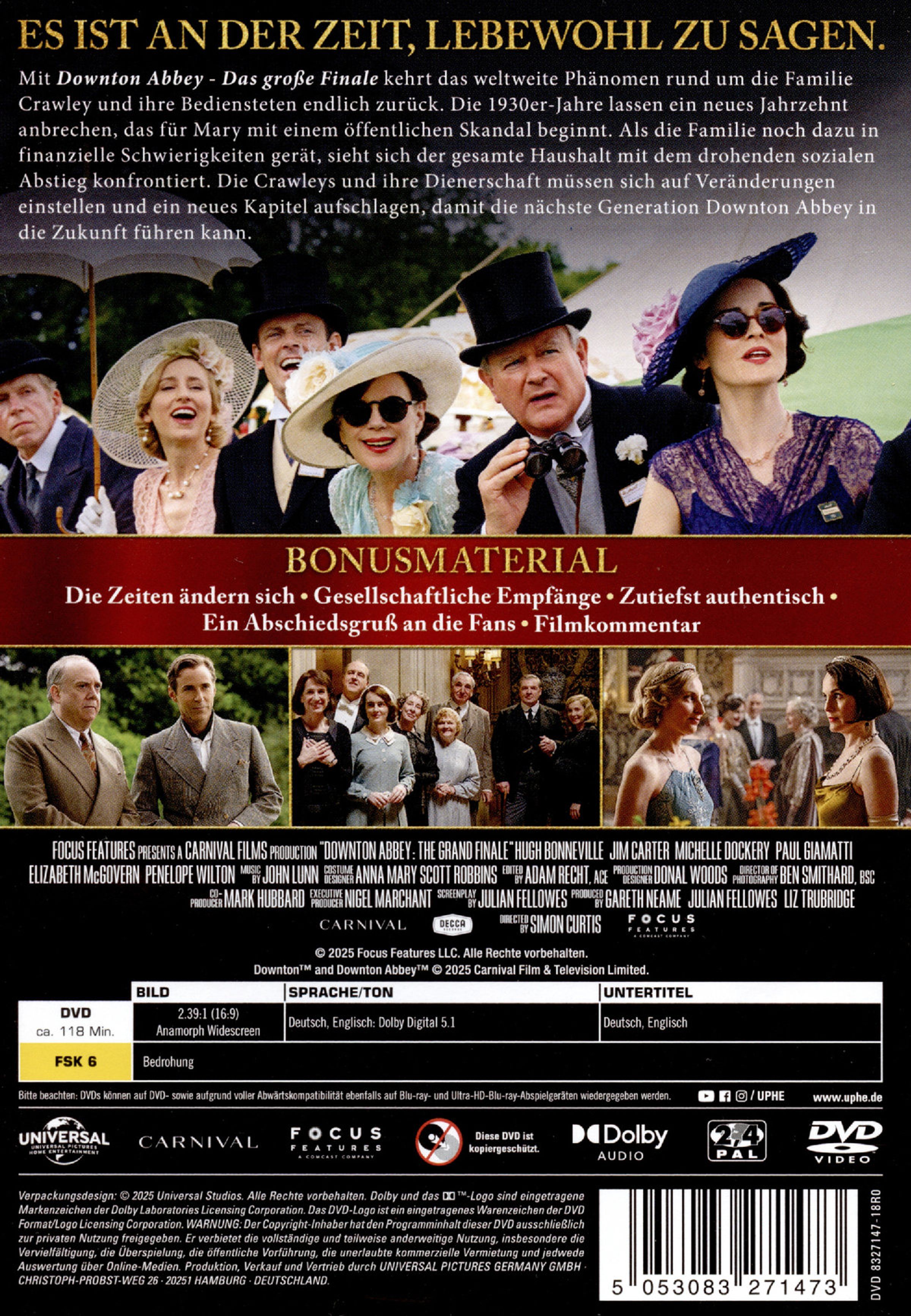 Mit DOWNTON ABBEY: DAS GROSSE FINALE kehrt das weltweite Phänomen rund um die Familie Crawley und ihre Bediensteten auf die große Leinwand zurück. Die 1930er-Jahre lassen ein neues Jahrzehnt anbrechen, das für Mary mit einem öffentlichen Skandal beginnt. Als die Familie noch dazu in finanzielle Schwierigkeiten gerät, sieht sich der gesamte Haushalt mit dem drohenden sozialen Abstieg konfrontiert. Die Crawleys und ihre Dienerschaft müssen sich auf Veränderungen einstellen und ein neues Kapitel aufschlagen, damit die nächste Generation Downton Abbey in die Zukunft führen kann.