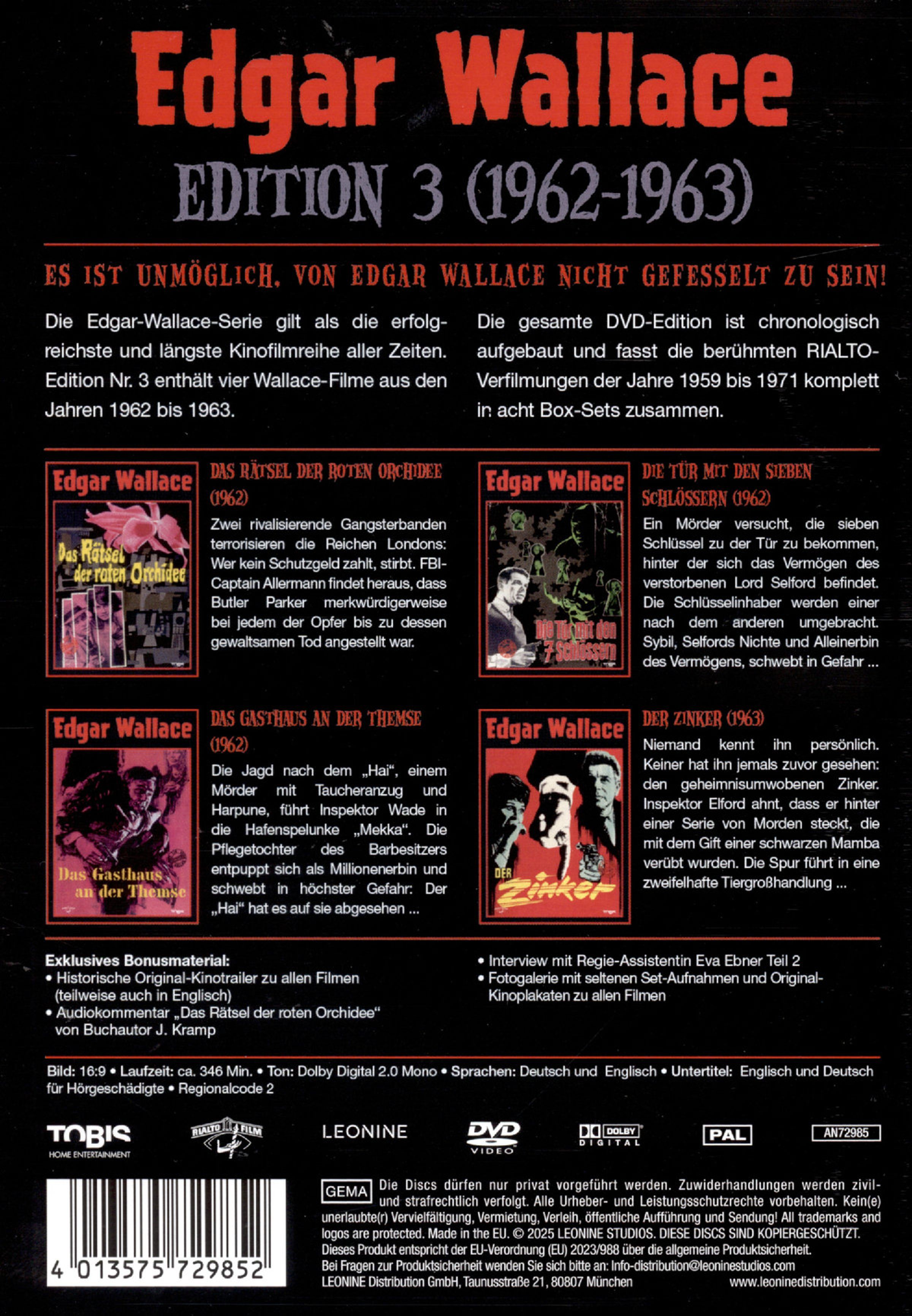 "Edgar Wallace Edition 3, 1962-1963. FSK 16. Eine Illustration mit Szenen und Figuren in Grün und Gelb auf schwarzem Hintergrund.", 4 DVDs