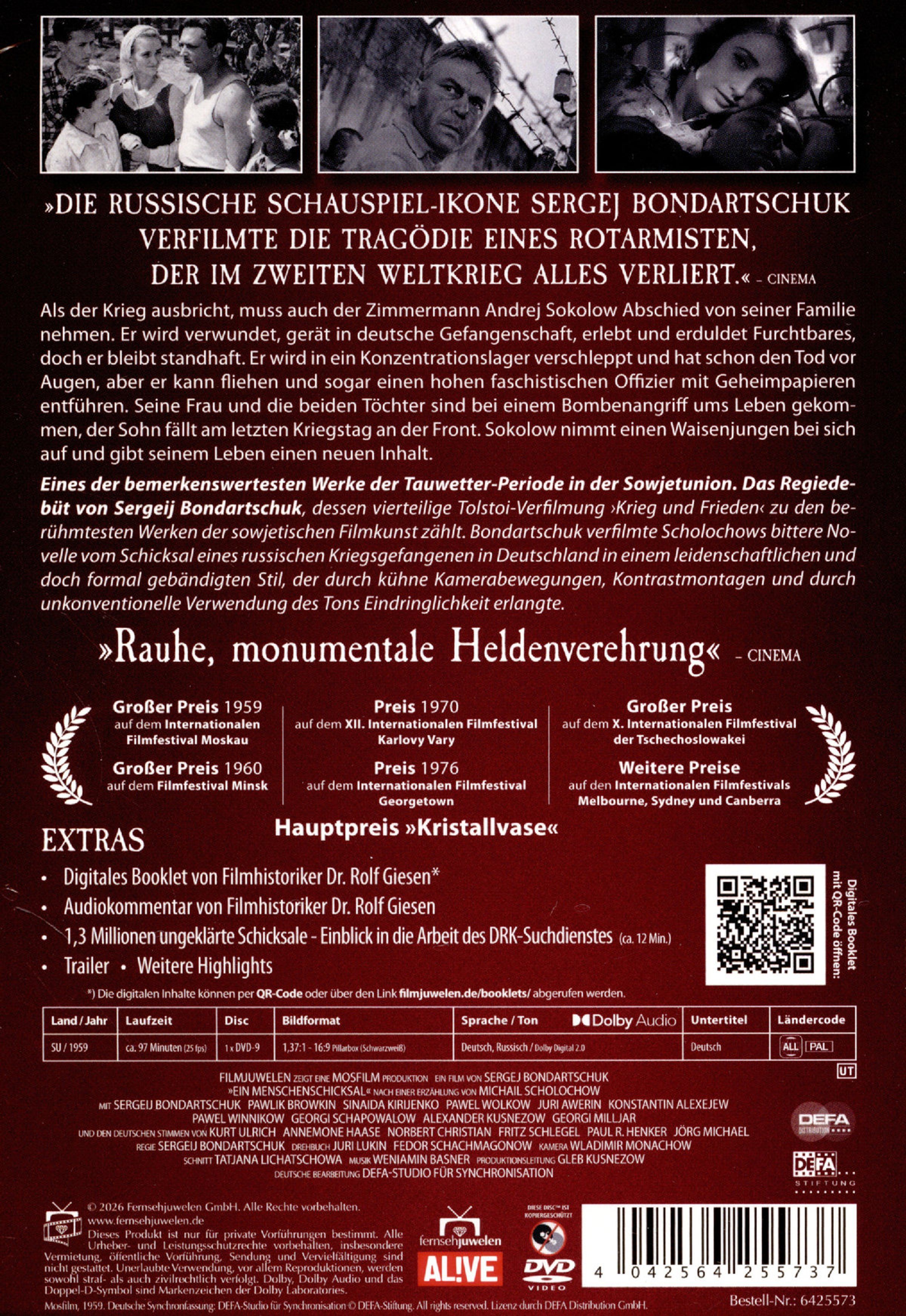 Das Regiedebüt von Sergeij Fjodorowitsch Bondartschuk, dessen vierteilige Tolstoi-Verfilmung »Krieg und Frieden« zu den berühmtesten Werken der sowjetischen Filmkunst zählt: Als der Krieg ausbricht, muss auch der Zimmermann Andrej Sokolow Abschied von seiner Familie nehmen. Er wird verwundet, gerät in deutsche Gefangenschaft, erlebt und erduldet Furchtbares, doch er bleibt standhaft. Er wird in ein Konzentrationslager verschleppt und hat schon den Tod vor Augen, aber er kann fliehen und sogar einen hohen faschistischen Offizier mit Geheimpapieren entführen. Seine Frau und die beiden Töchter sind bei einem Bombenangriff ums Leben gekommen, der Sohn fällt am letzten Kriegstag an der Front. Sokolow nimmt einen Waisenjungen bei sich auf und gibt seinem Leben einen neuen Inhalt.