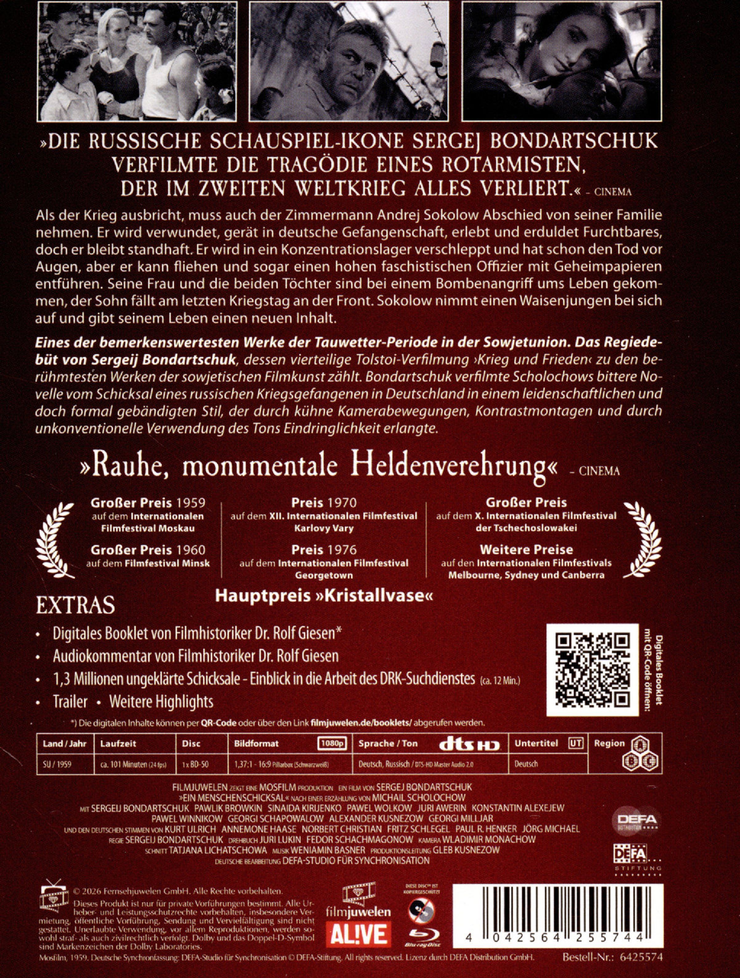Das Regiedebüt von Sergeij Fjodorowitsch Bondartschuk, dessen vierteilige Tolstoi-Verfilmung »Krieg und Frieden« zu den berühmtesten Werken der sowjetischen Filmkunst zählt: Als der Krieg ausbricht, muss auch der Zimmermann Andrej Sokolow Abschied von seiner Familie nehmen. Er wird verwundet, gerät in deutsche Gefangenschaft, erlebt und erduldet Furchtbares, doch er bleibt standhaft. Er wird in ein Konzentrationslager verschleppt und hat schon den Tod vor Augen, aber er kann fliehen und sogar einen hohen faschistischen Offizier mit Geheimpapieren entführen. Seine Frau und die beiden Töchter sind bei einem Bombenangriff ums Leben gekommen, der Sohn fällt am letzten Kriegstag an der Front. Sokolow nimmt einen Waisenjungen bei sich auf und gibt seinem Leben einen neuen Inhalt.