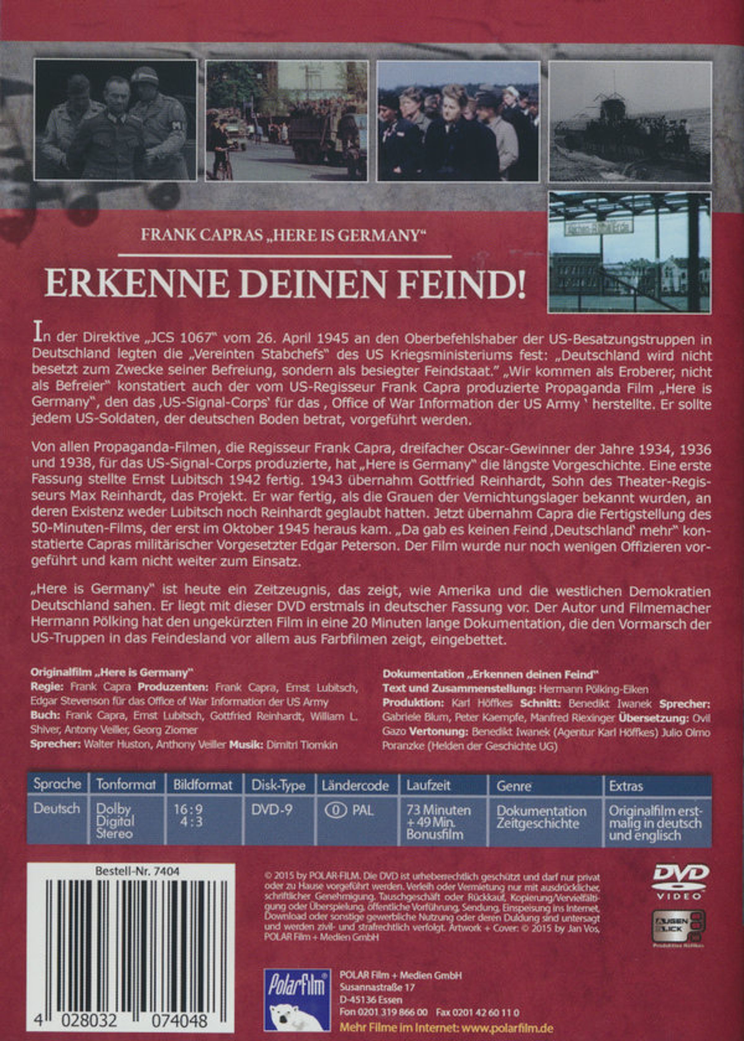 Von allen Propaganda-Filmen, die Regisseur Frank Capra, dreifache Oscar-Gewinner der Jahre 1934, 1936 und 1938, für das US-Signal-Corps produzierte, hat „Here is Germany“ die längste Vorgeschichte. Eine erste Fassung stellte Ernst Lubitsch 1942 fertig. 1943 übernahm Gottfried Reinhardt, Sohn des Theater-Regisseurs Max Reinhardt, das Projekt. Er war fertig, als die Grauen der Vernichtungslager bekannt wurden, an deren Existenz weder Capra noch Reinhardt geglaubt hatten. Jetzt übernahm Capra die Fertigstellung des 50-Minuten-Films, der erst im Oktober 1945 heraus kam.