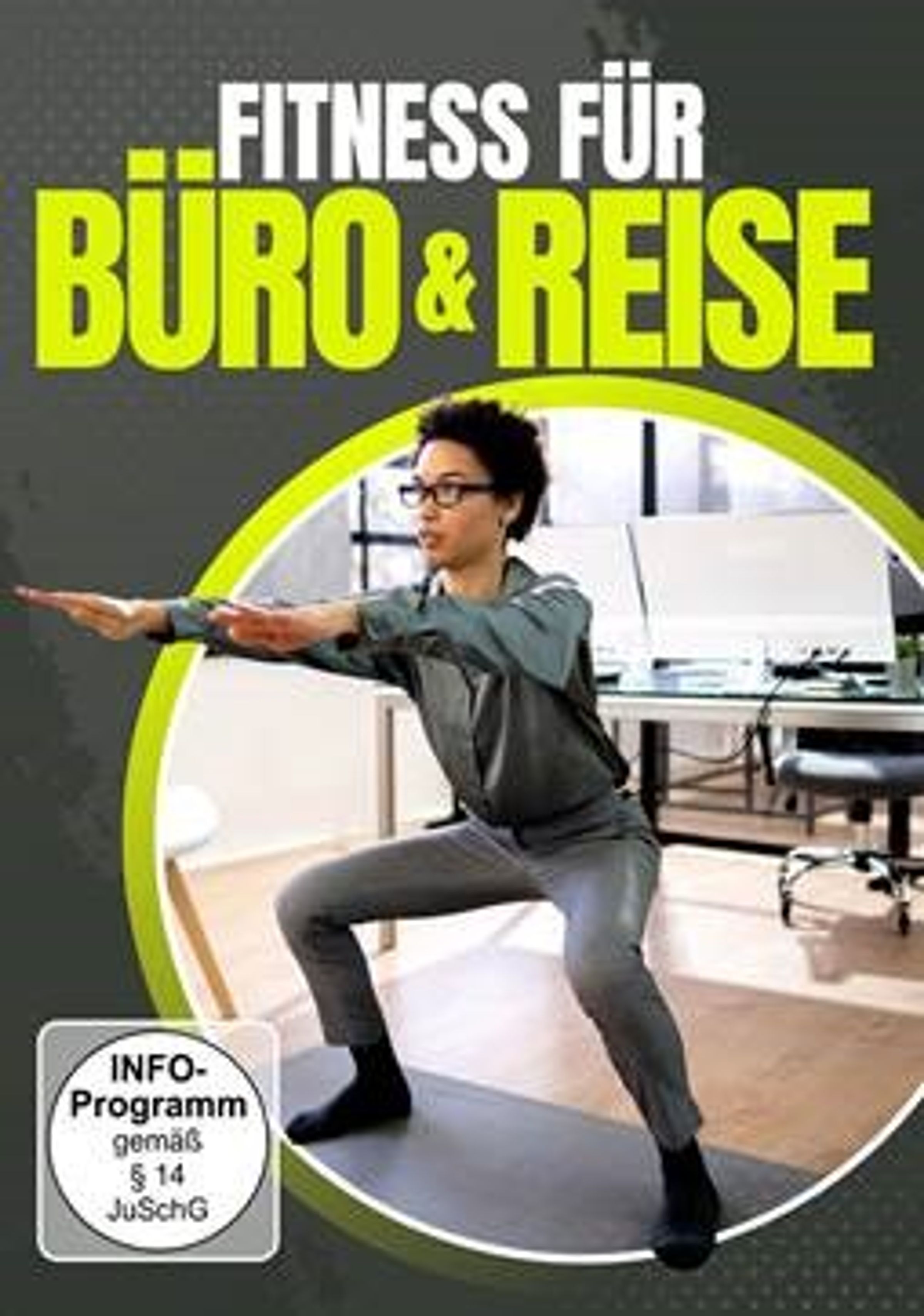 "FITNESS FÜR BÜRO & REISE" steht oben. Eine Person macht Übungen in einem Büro., DVD