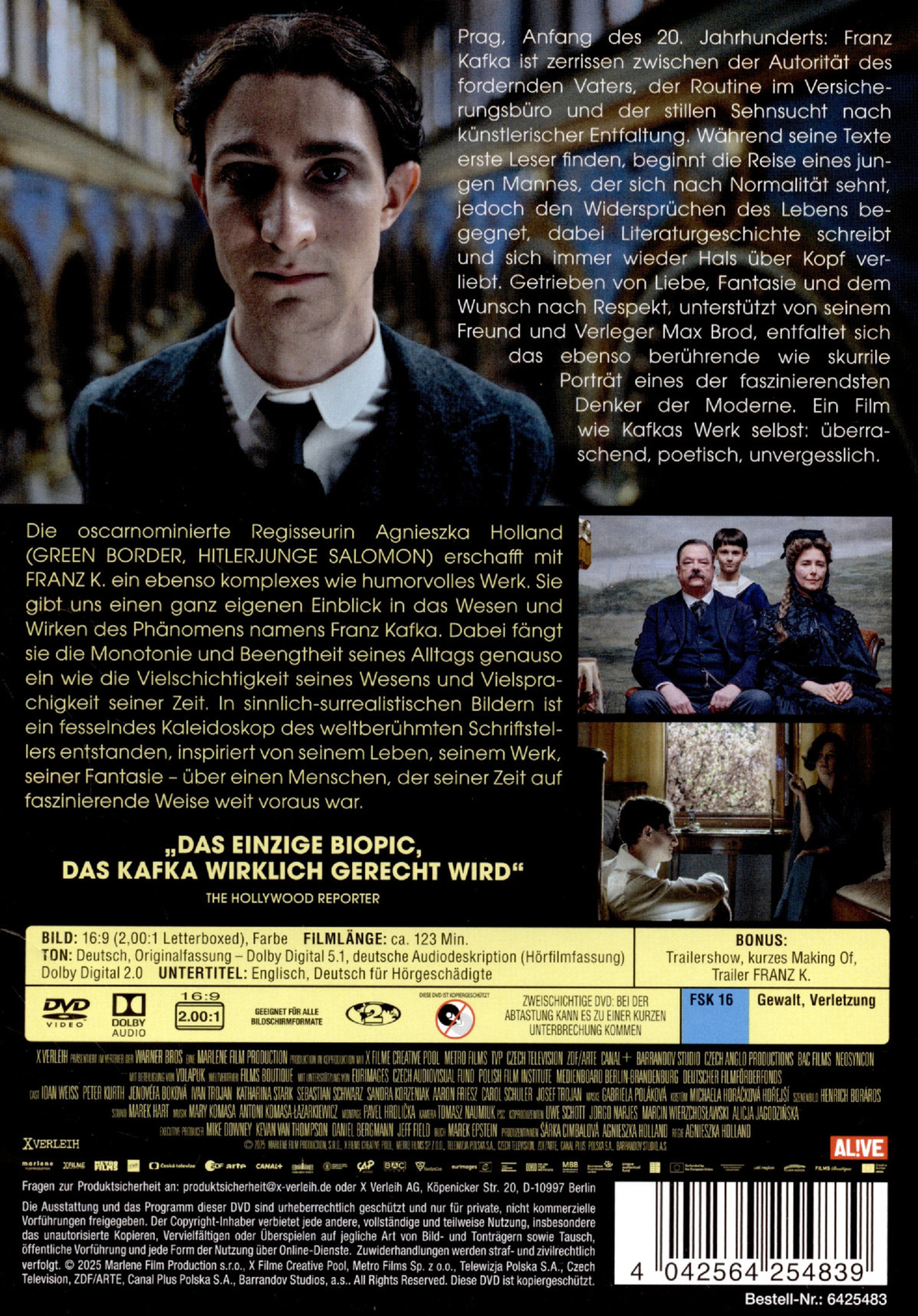 Prag, Anfang des 20. Jahrhunderts: Franz Kafka ist zerrissen zwischen der Autorität des fordernden Vaters, der Routine im Versicherungsbüro und der stillen Sehnsucht nach künstlerischer Entfaltung. Während seine Texte erste Leser finden, beginnt die Reise eines jungen Mannes, der sich nach Normalität sehnt, jedoch den Widersprüchen des Lebens begegnet, dabei Literaturgeschichte schreibt und sich immer wieder Hals über Kopf verliebt. Getrieben von Liebe, Fantasie und dem Wunsch nach Respekt, unterstützt von seinem Freund und Verleger Max Brod, entfaltet sich das ebenso berührende wie skurrile Porträt eines der faszinierendsten Denker der Moderne. Ein Film wie Kafkas Werk selbst: überraschend, poetisch, unvergesslich.