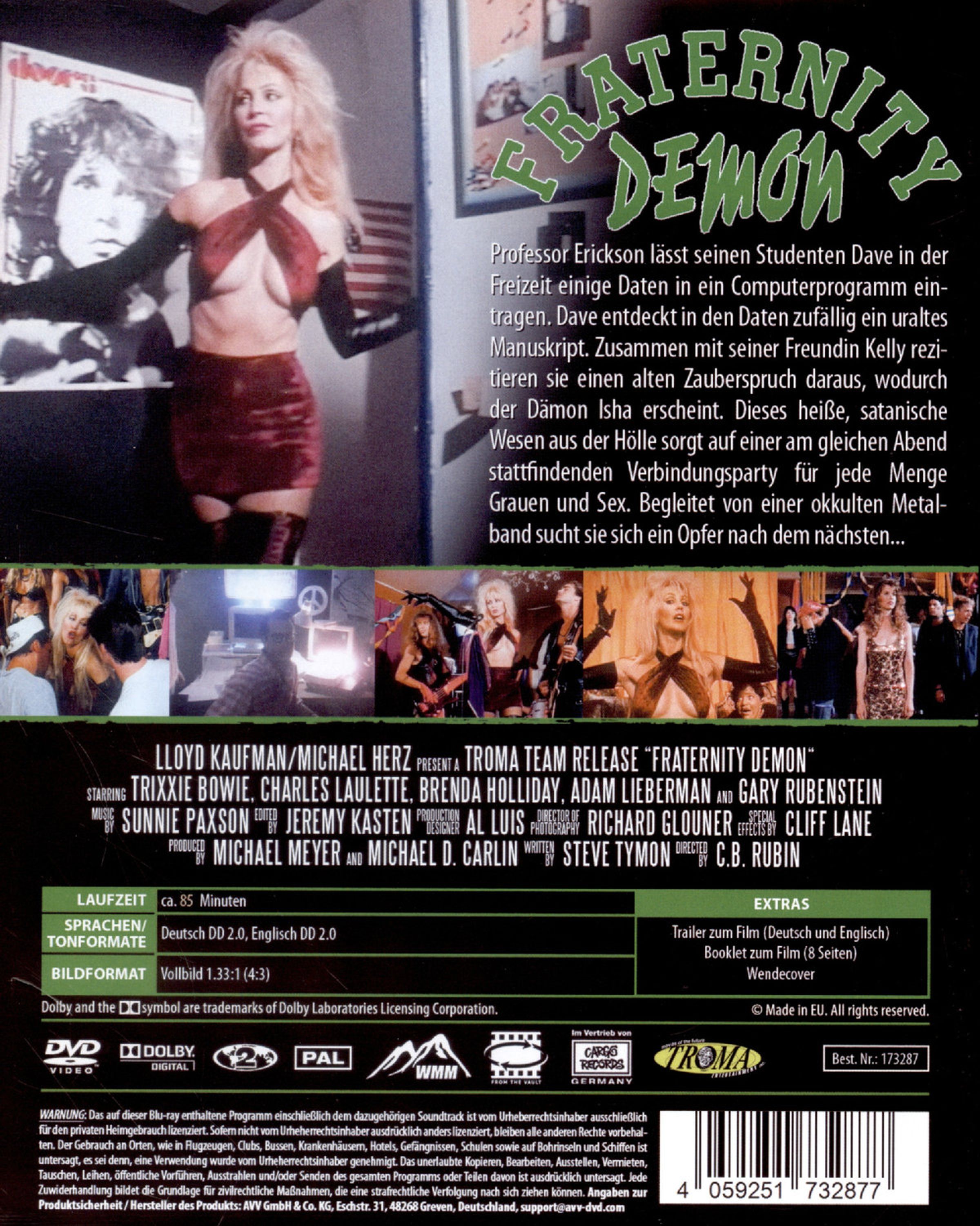 "FRATERNITY DEMON" in Grün, "MIT DEUTSCHER SYNCHRO" auf grünem Kreis. Unten: "HEAVY METAL, SCHARFE GIRLS UND DÄMONISCHE LUST..."., DVD